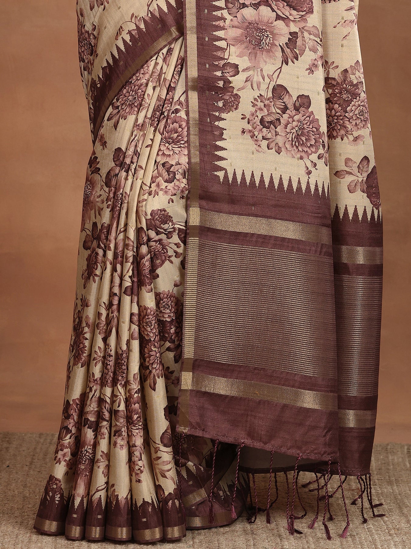 Beige Printed Silk Blend Sarees With Unstitched Blouse Piece