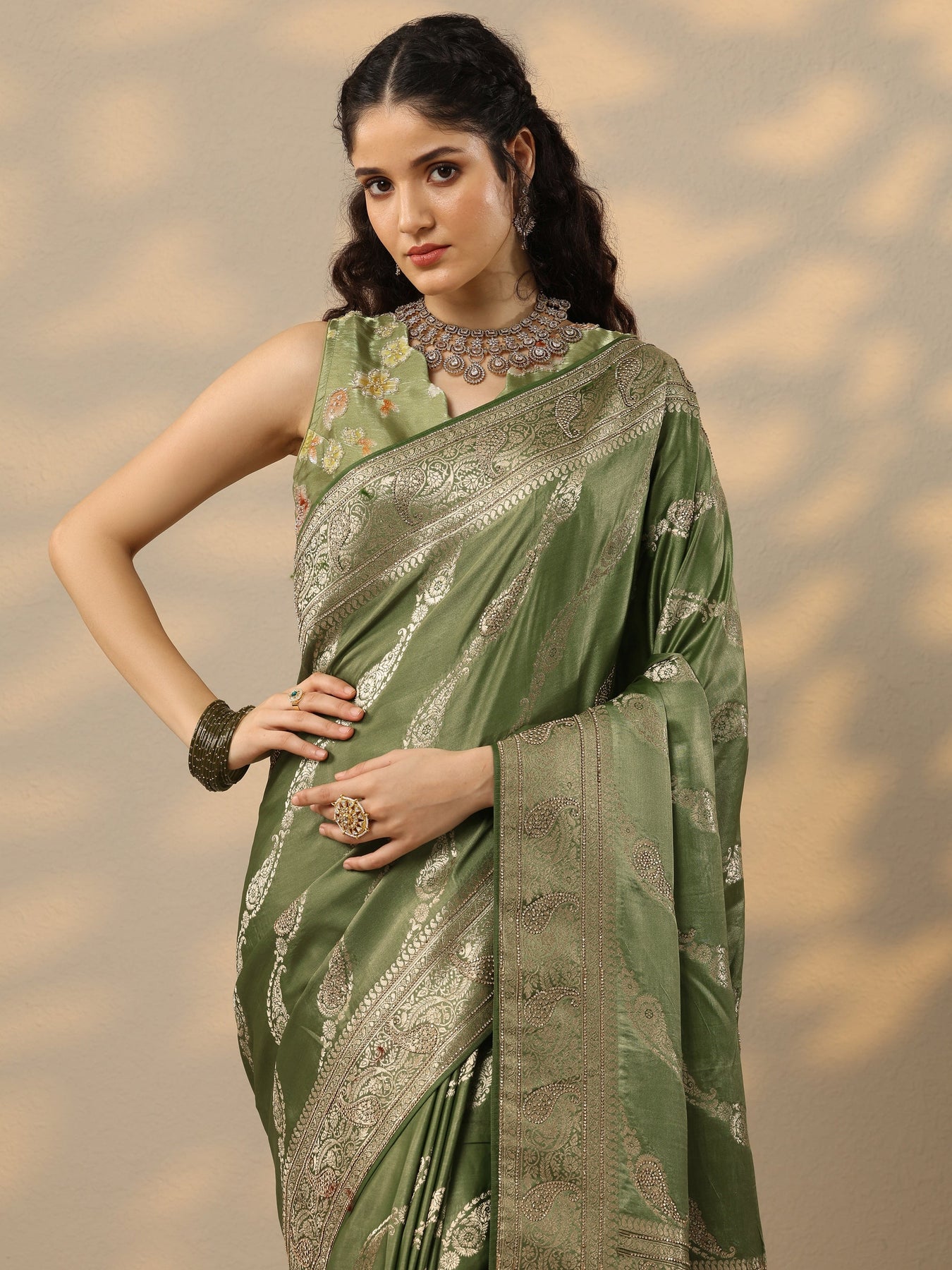 Our olive printed silk blend saree features captivating embellishments. Complemented with a stitched blouse. This charming saree is perfect for festive occasions.