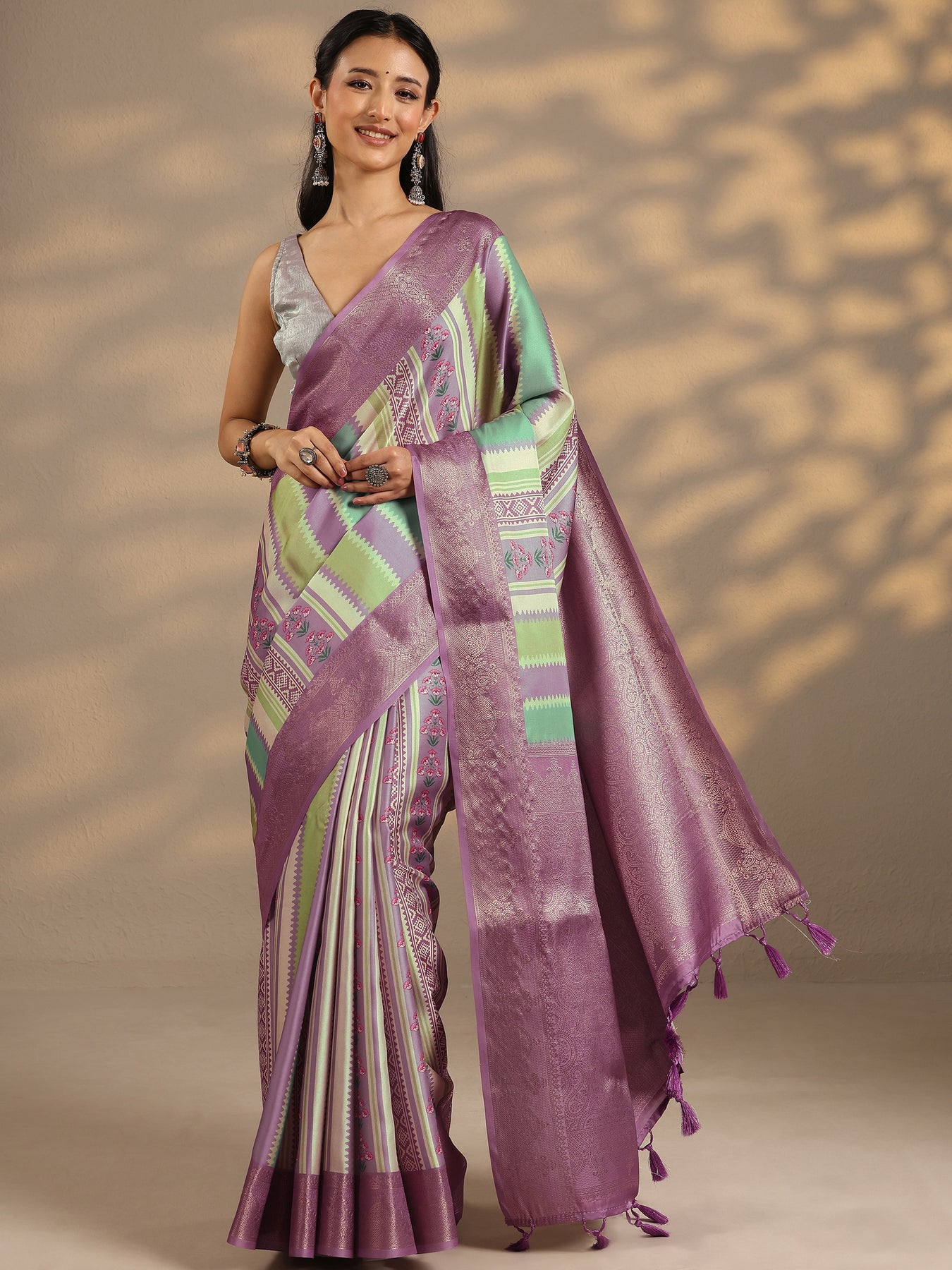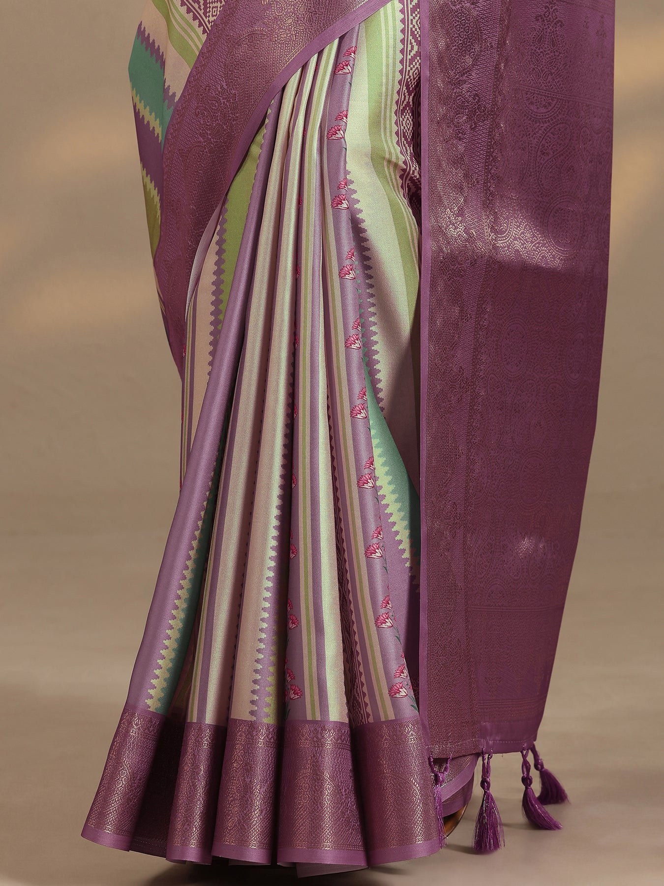 Our lavender printed silk blend saree features captivating geometric print. Complemented with a Unstitched Blouse Piece. This charming saree is perfect for festive occasions.