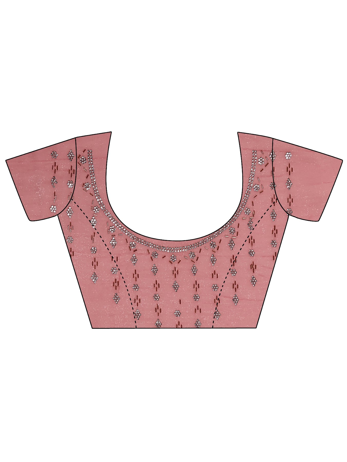 Our Peach Embellished silk blend saree features captivating embellishments. Complemented with a Unstitched Blouse Piece. This charming saree is perfect for festive occasions.
