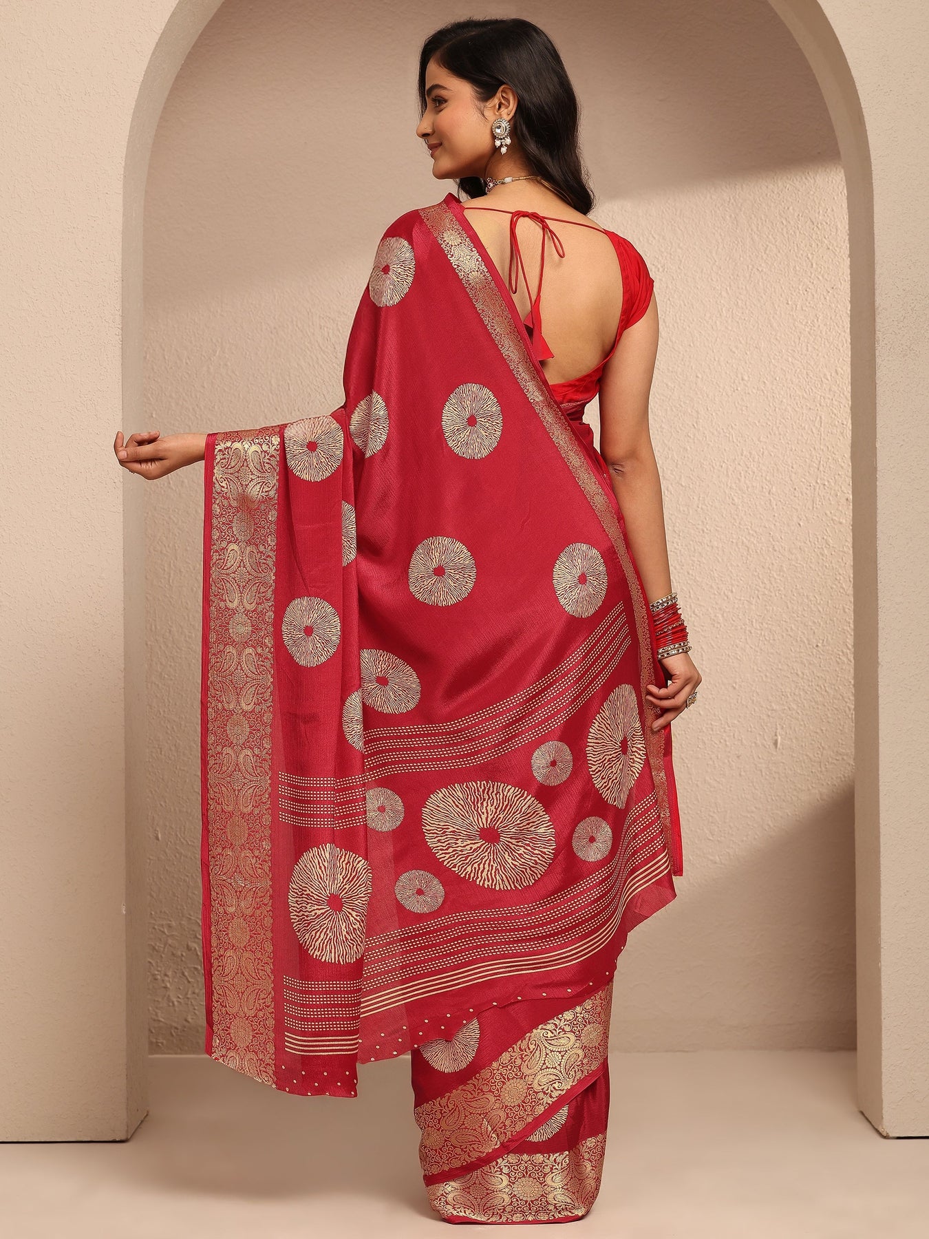 Our Red printed Silk blend saree features captivating embellishments. Complemented with a Unstitched BlousePiece. This charming saree is perfect for festive occasions.