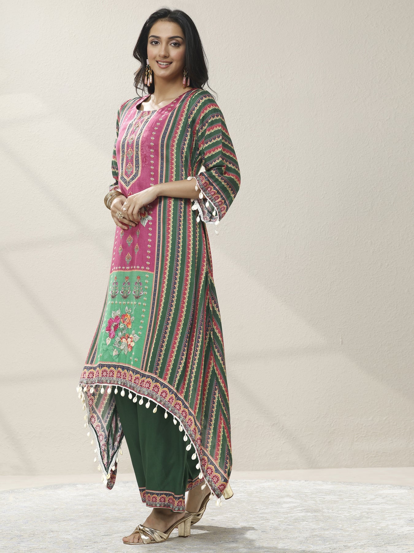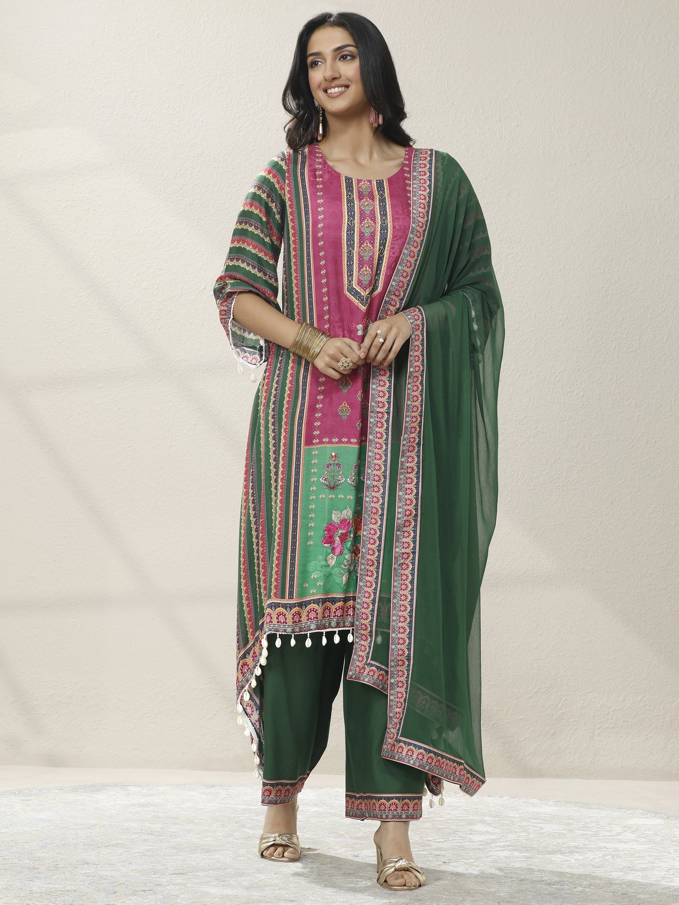 Our 3-piece Green and Pink Muslin Straight-fit Kurta Set features a Round Neckline, Regular Sleeves, and statement Yoke. Complemented with Salwar Pants with a Partially Elasticated waistband, and a Printed dupatta. Adorned with ethnic motif printed, this style is perfect for Festive occasions.