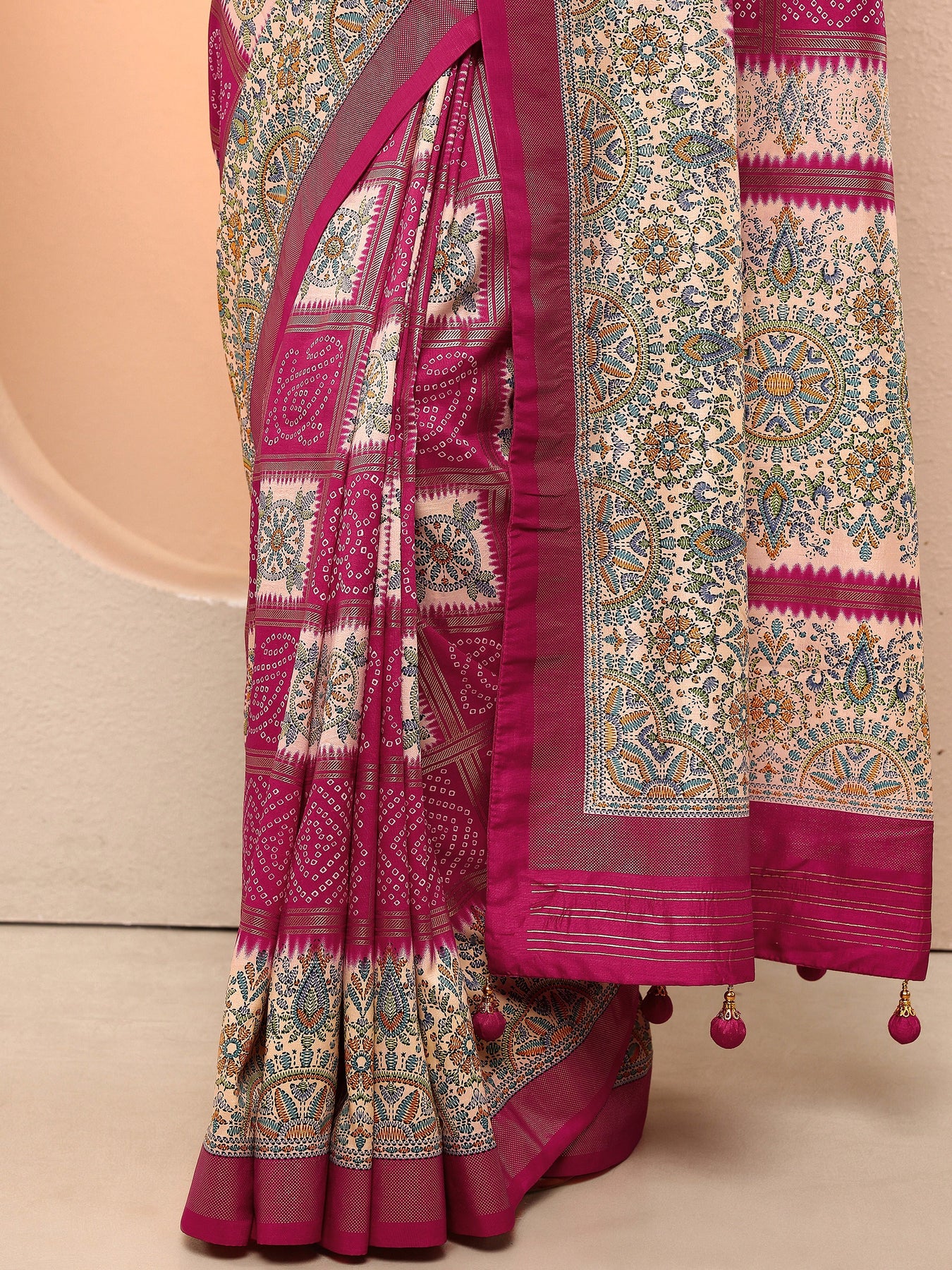 Pink Bandhani Printed Sarees With Unstitched Blouse Piece