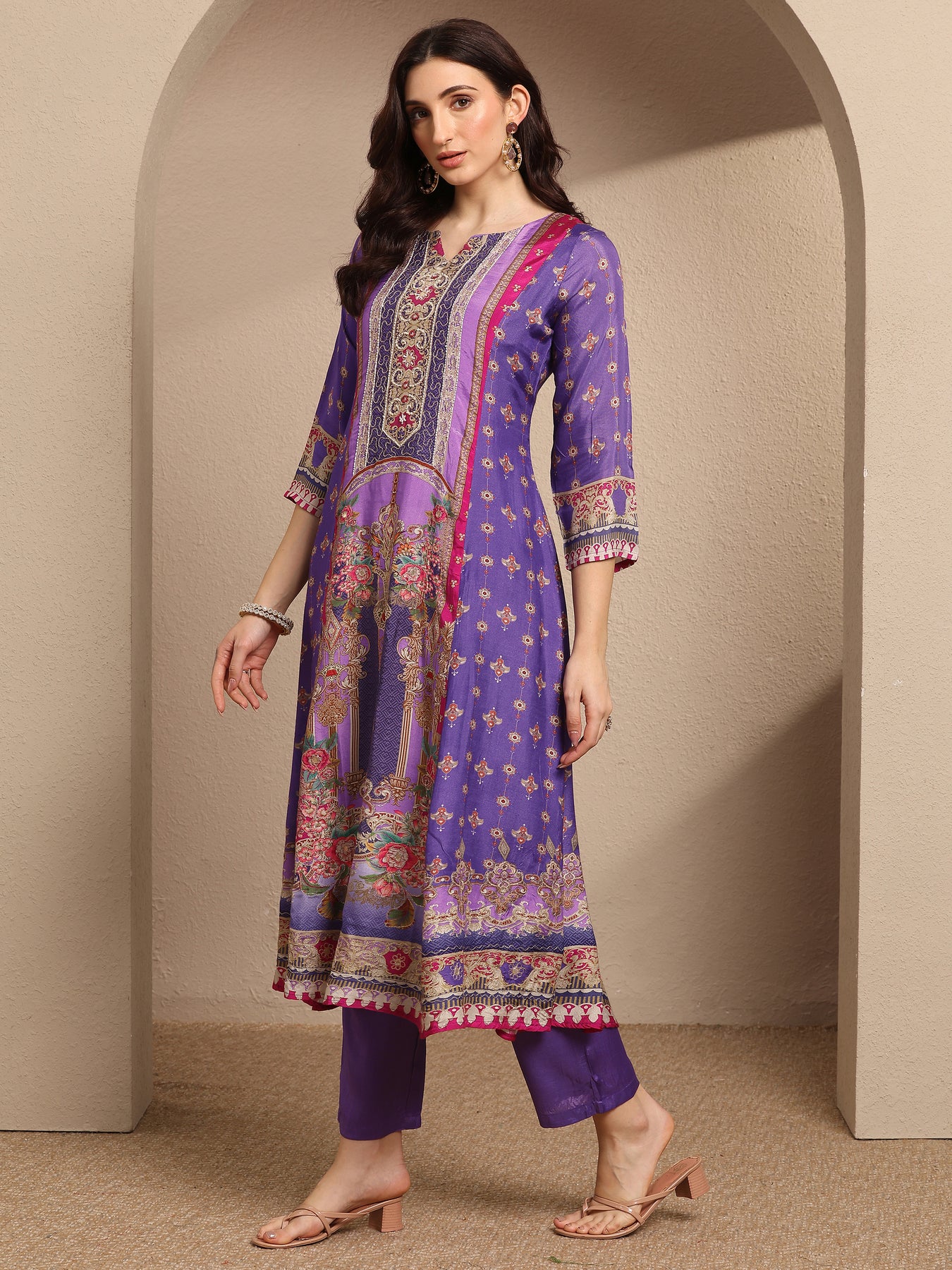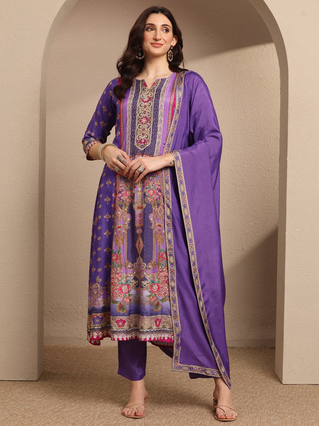 Purple Printed Muslin A-Line Suit Set With Dupatta