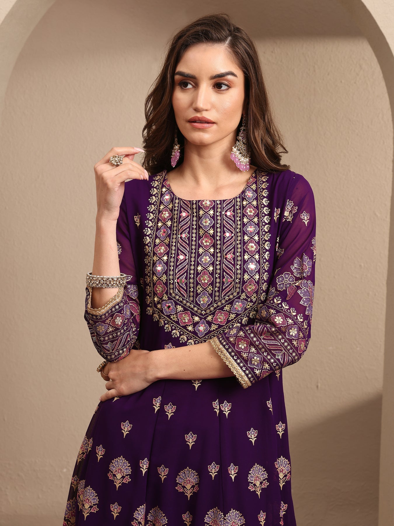 Purple Embroidered Georgette A-line Suit Set With Dupatta