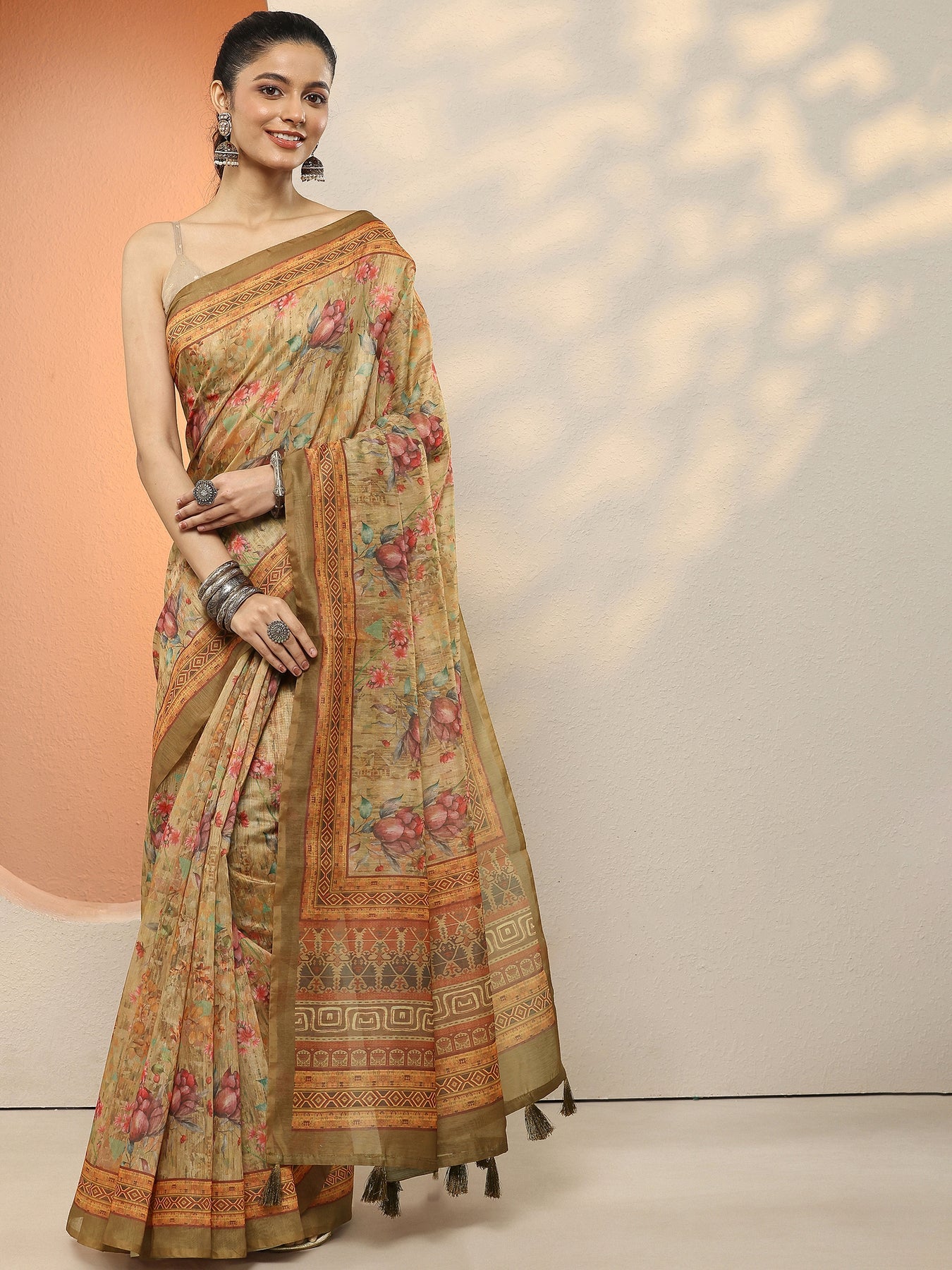 Yellow Printed Silk Blend Sarees With Unstitched Blouse Piece