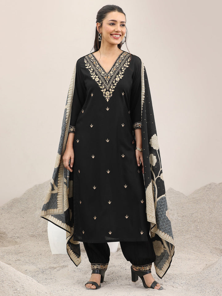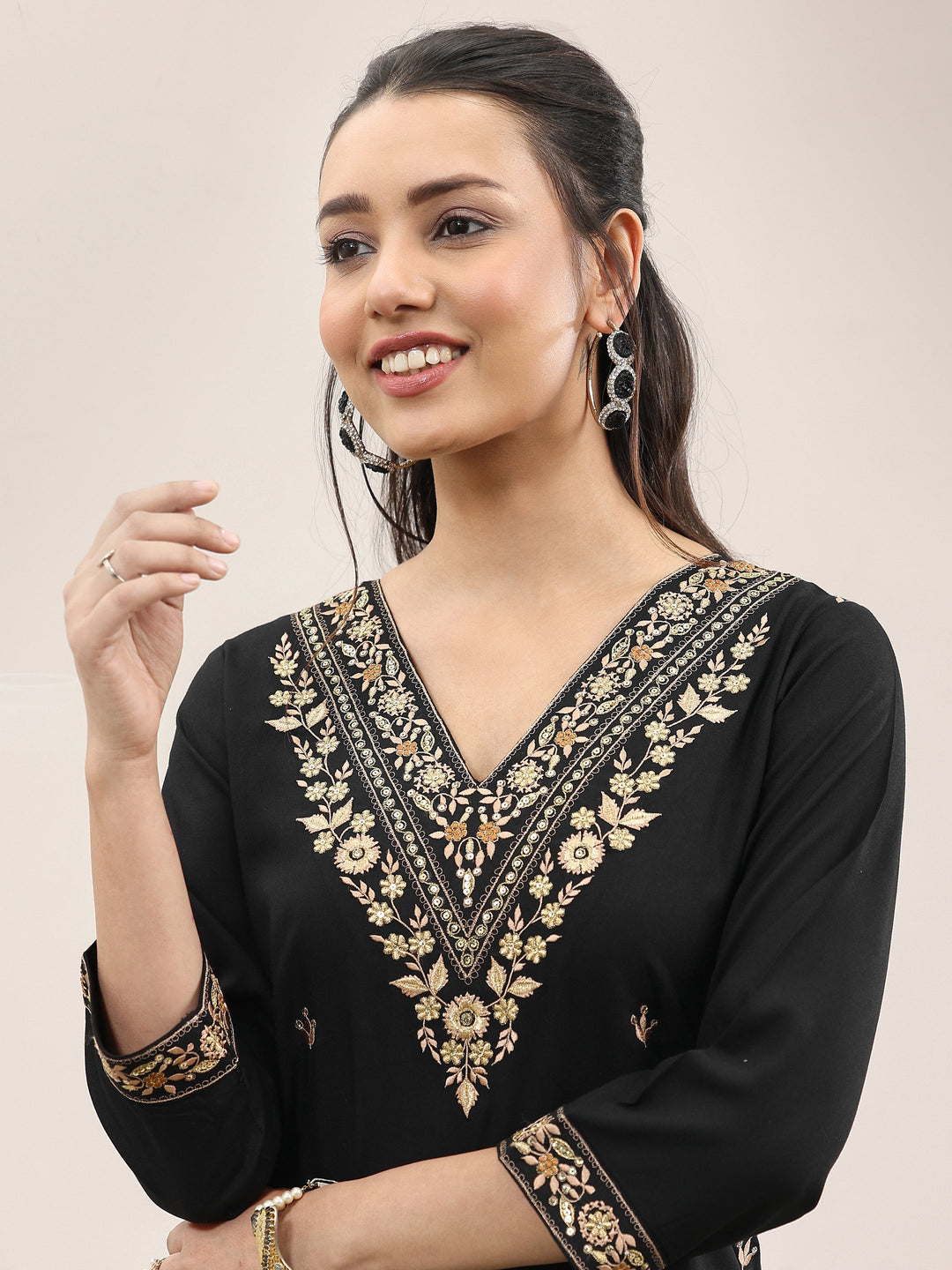 Our 3-piece black viscose rayon printed straight suit set features a straight-fit kurta with a classic V-neckline, three-quarter sleeves and a statement yoke. Highlighted with matching salwar pants with a partially elasticated waistband, roomy pockets and a printed dupatta. Elevated with block prints, fabric-trim accents, charming sequins and thread-work accents, this charming style is ideal for casual outings.