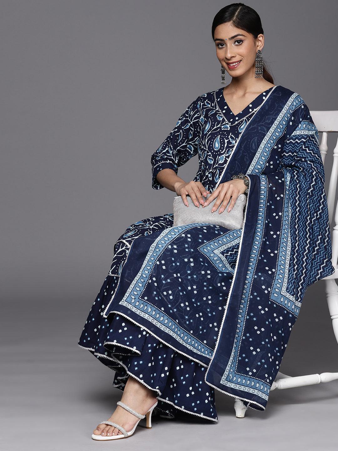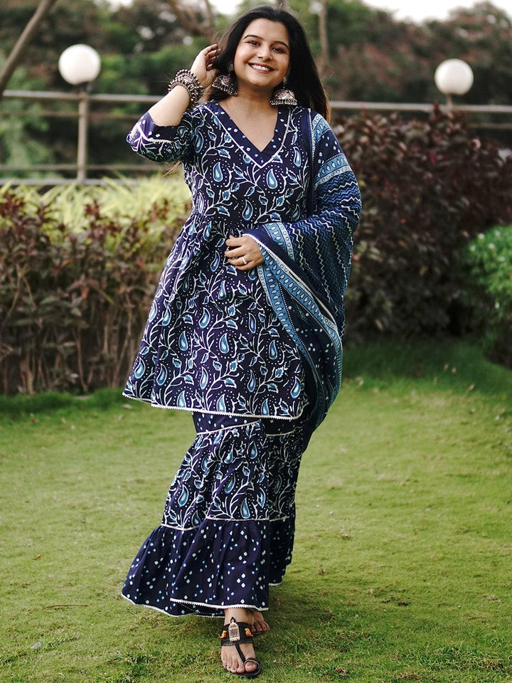 Our 3-piece indigo blue floral print cotton suit set features an Anarkali short kurti with a V-neckline and three-quarter sleeves. Complemented with sharara pants with a partially elasticated waistband and a dupatta in a matching print. Adorned with delicate Gota Patti and fabric-trim accents, this elegant style is perfect for casual outings.