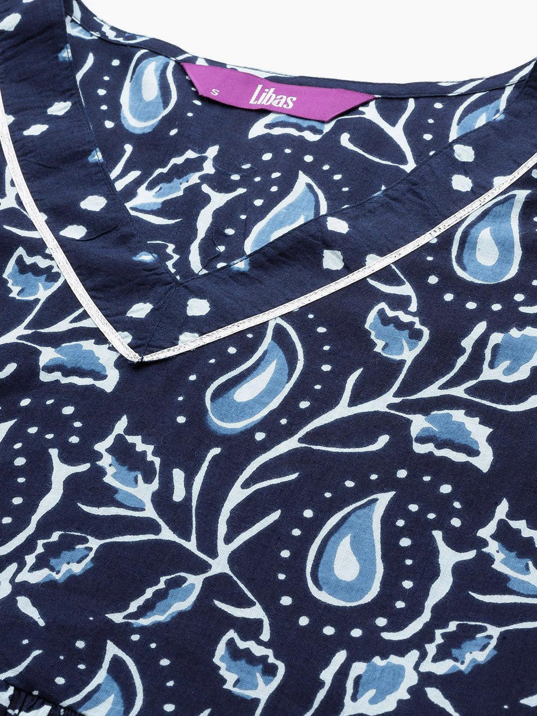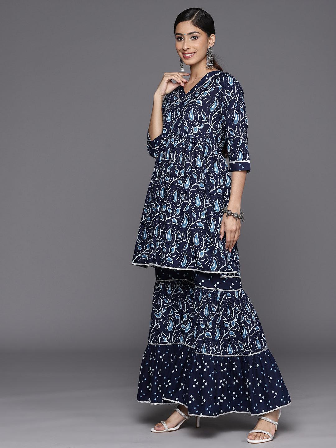 Blue Printed Cotton Anarkali Suit Set With Sharara - ShopLibas
