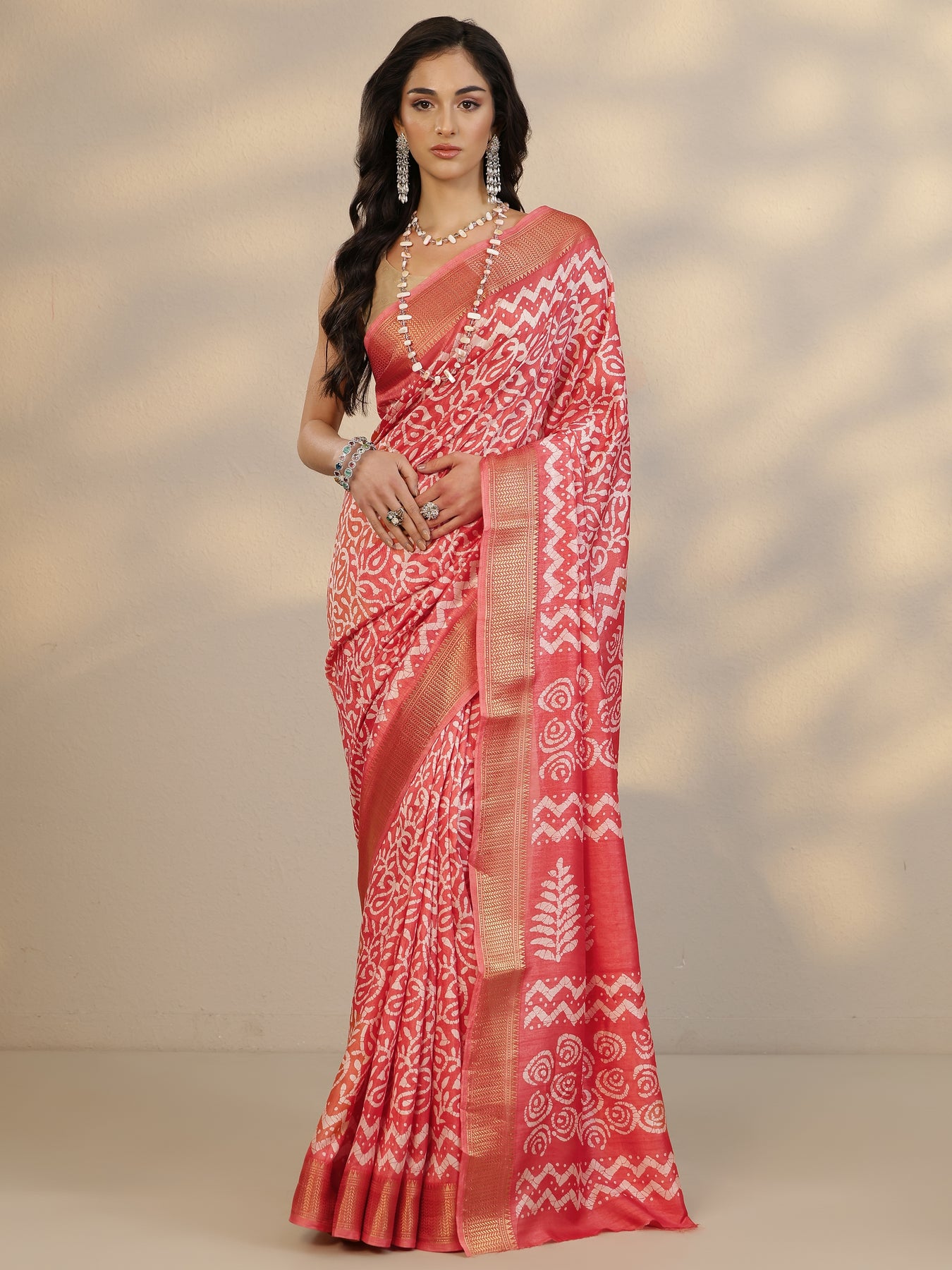 Coral Batik Printed Silk Blend Saree With Unstitched Blouse Piece