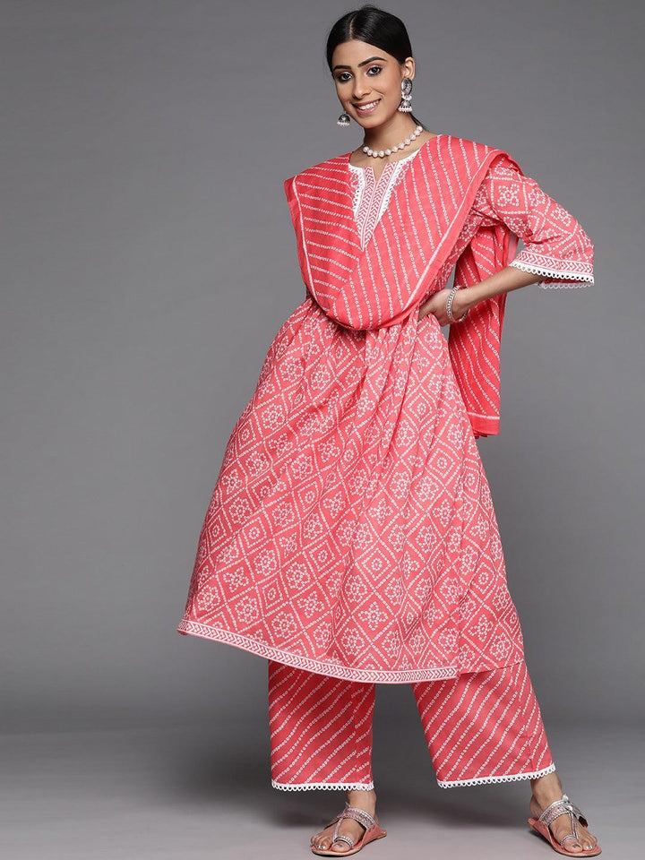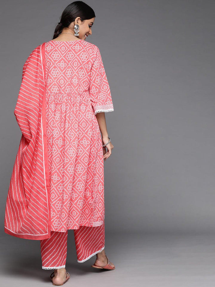 Our 3-piece coral Bandhani inspired print cotton suit set features an Anarkali kurta with a notched neckline, straight palazzo pants with a partially elasticated waistband and roomy pockets, and a dupatta in a contrasting leheriya print. Adorned with enchanting fabric and lace-trim accents, this refreshing style is ideal for daytime festivities.