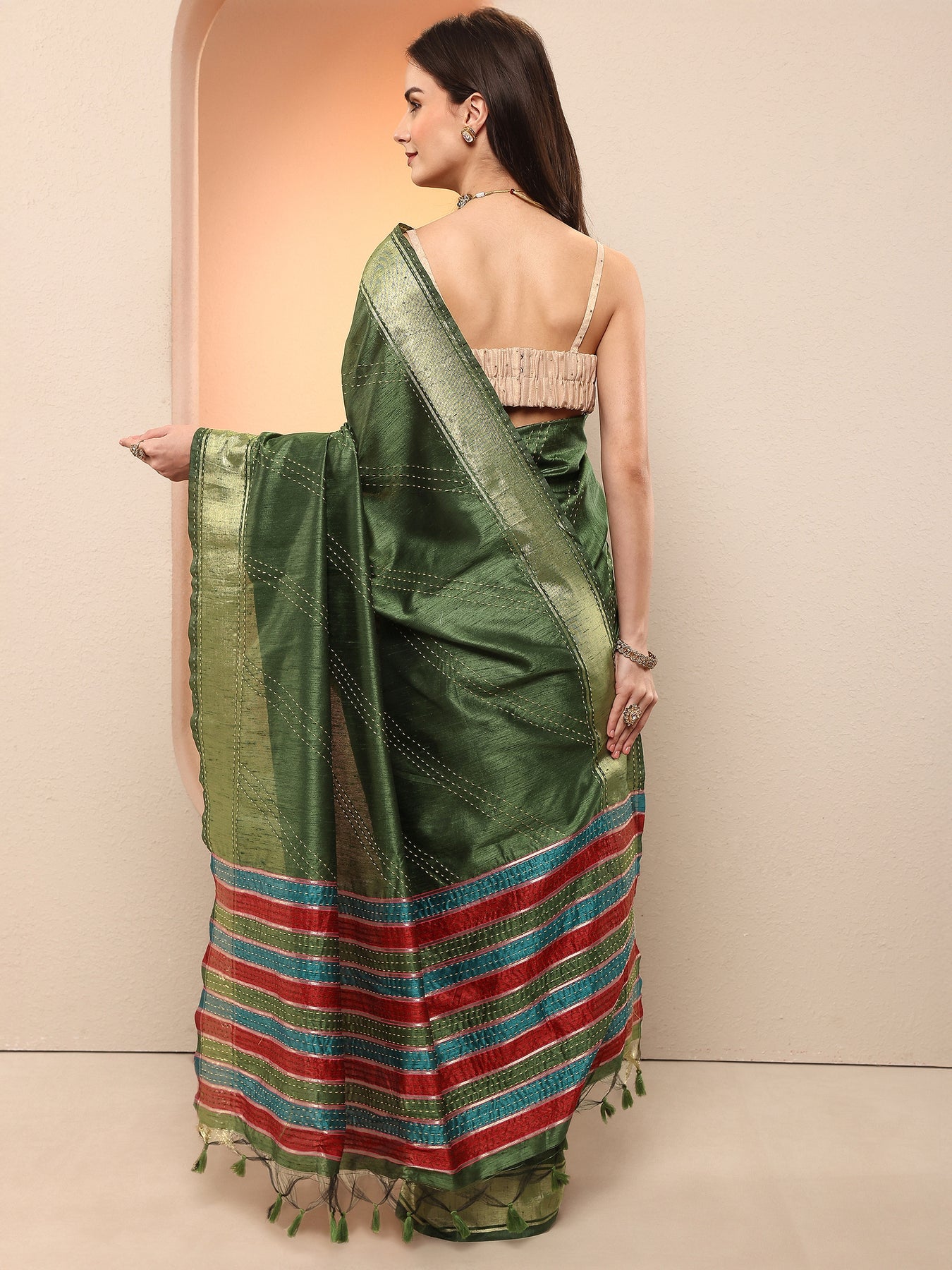 Green Embellished Silk Blend Sarees With Unstitched Blouse Piece