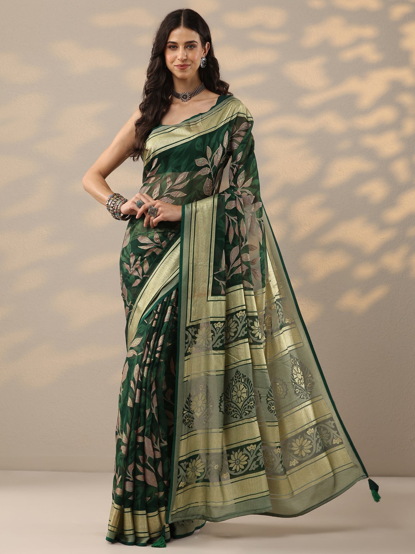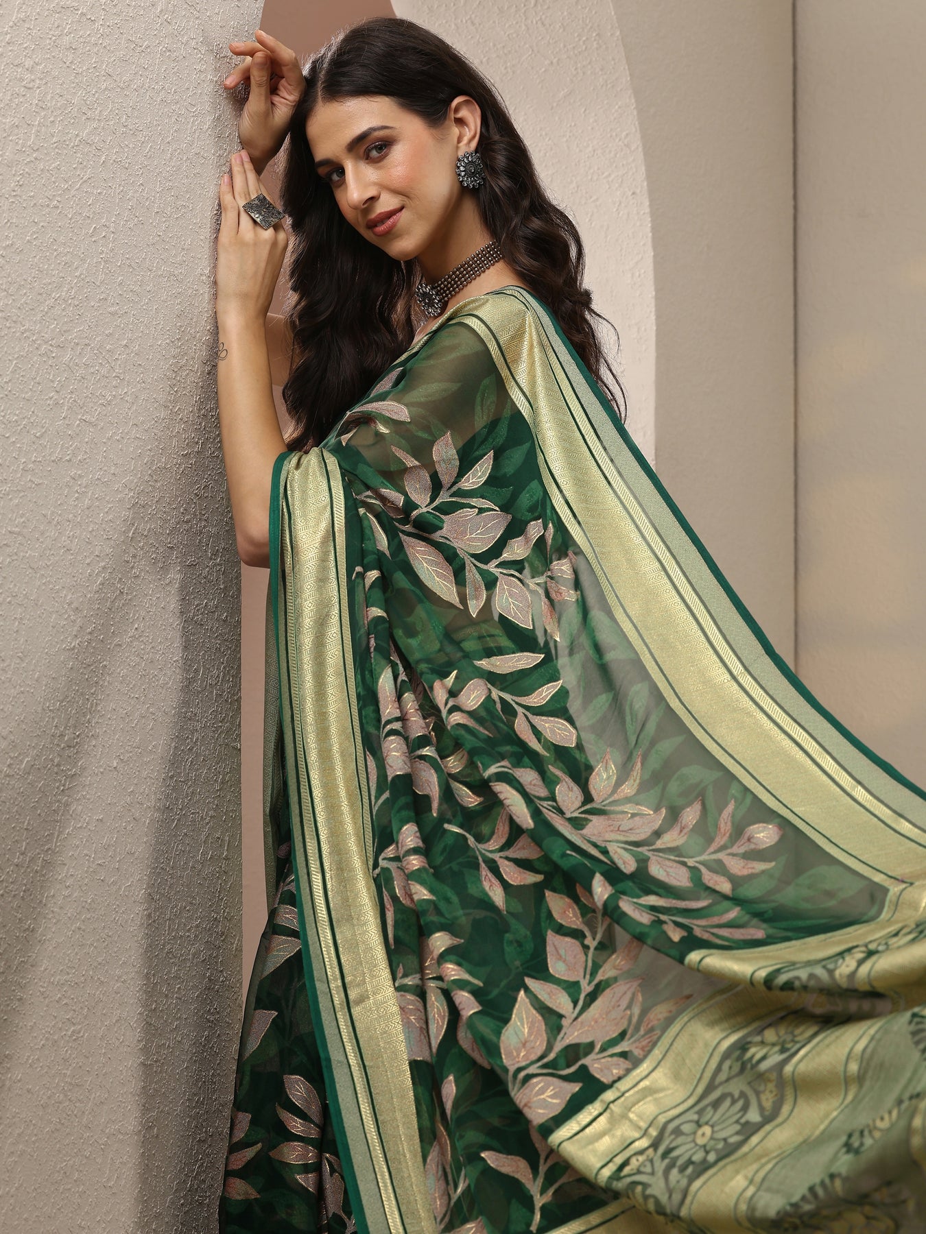 Green Printed Silk Blend Saree With Unstitched Blouse Piece