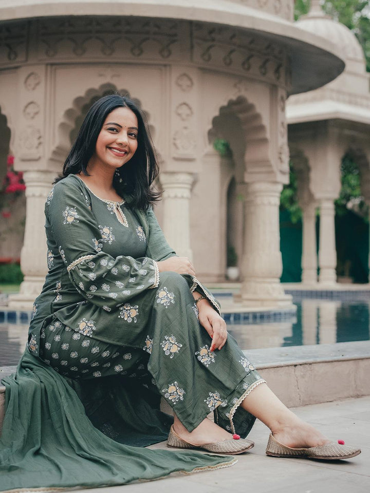 This 3-piece suit set includes our olive green straight kurta, staright palazzo pants and a matching dupatta. Featuring striking motifs, key-hole neckline, comfortable bell sleeves and lace trim details. Ideal for intimate wedding celebrations.
