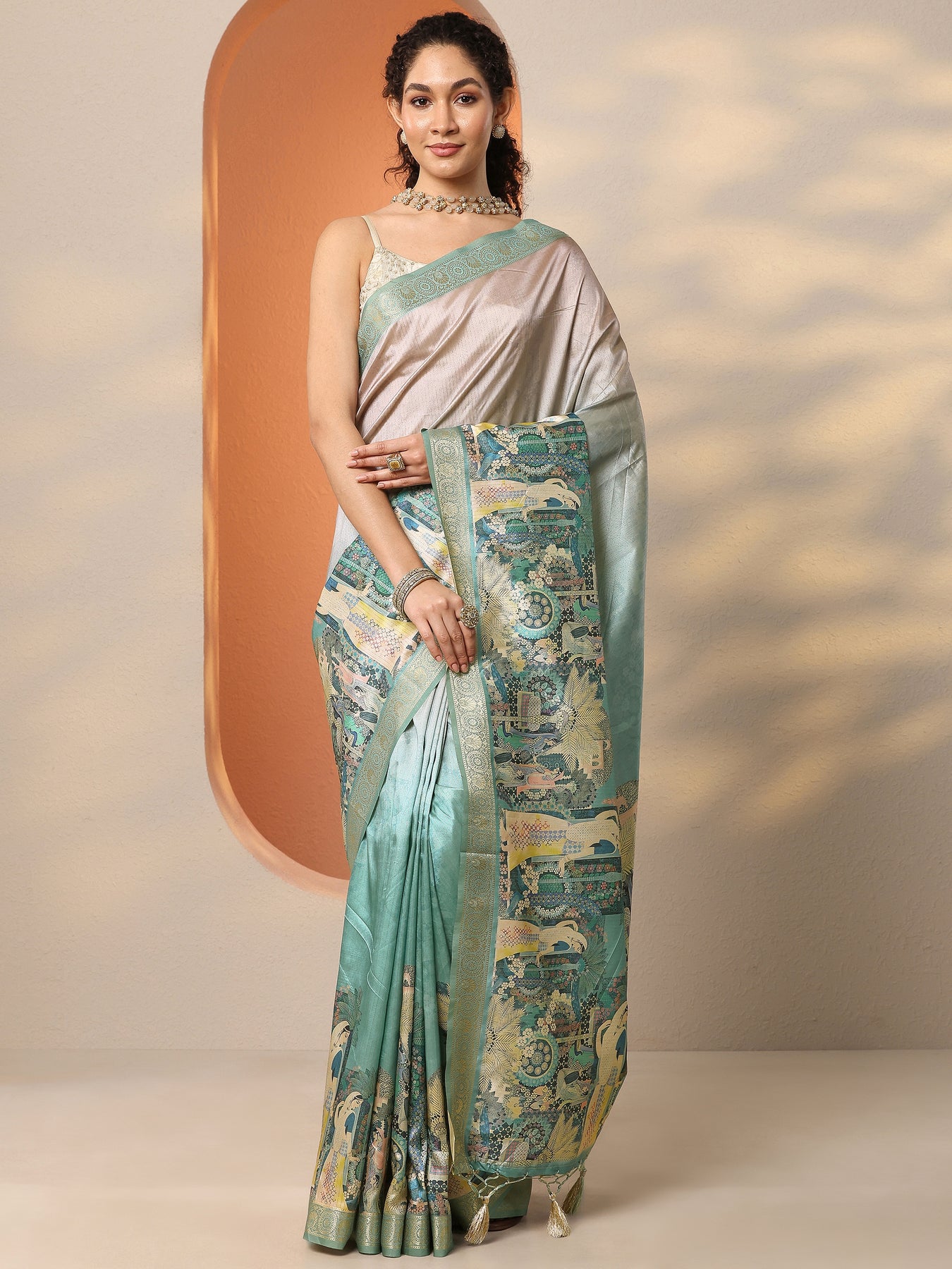 Green Tribal Printed Silk Blend Saree With Unstitched Blouse Piece