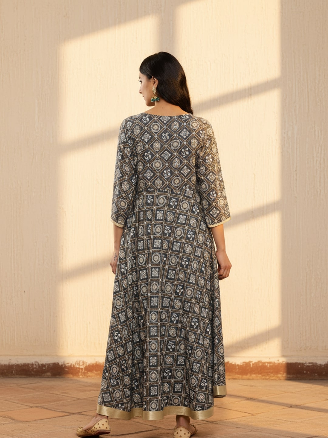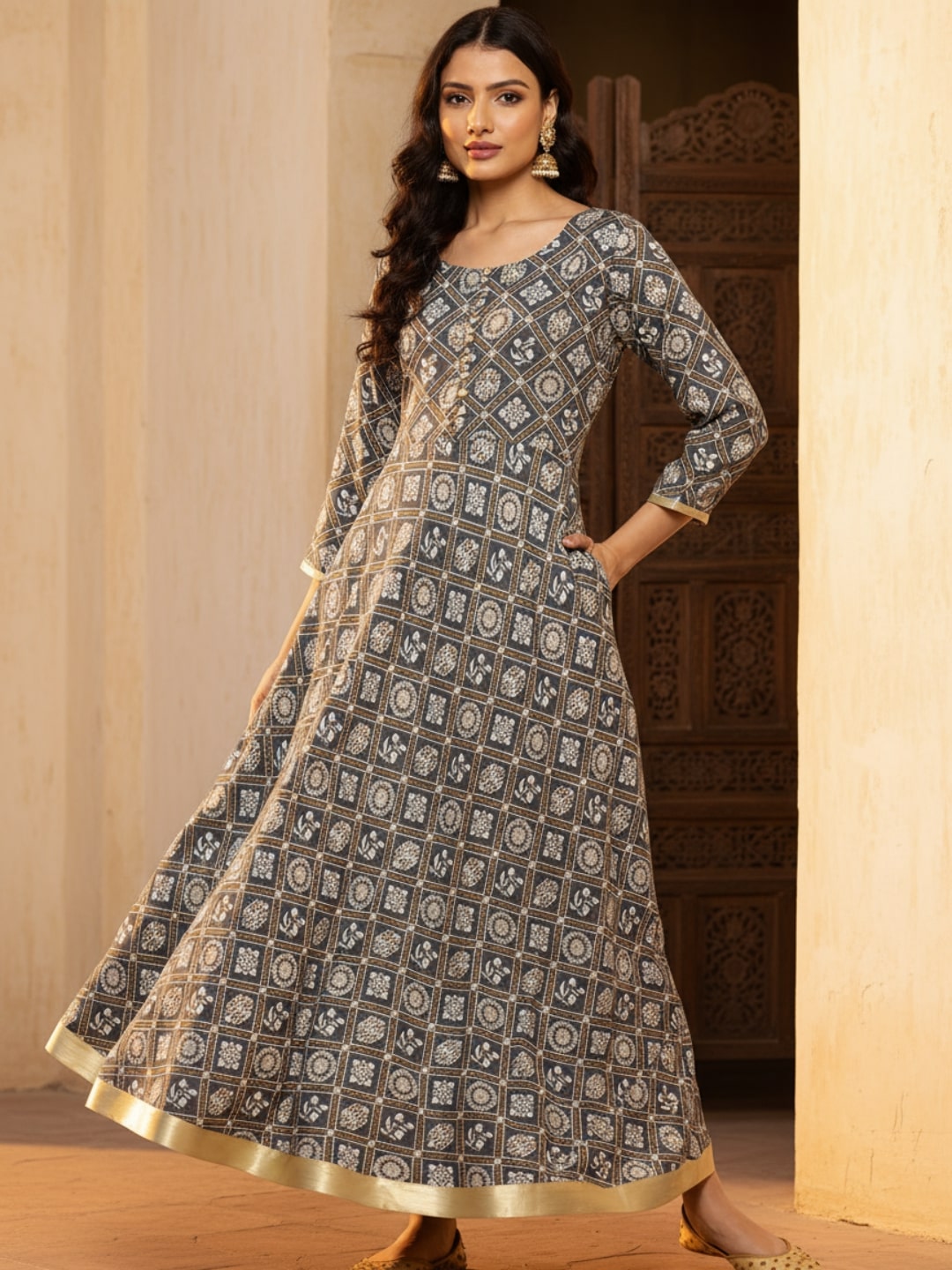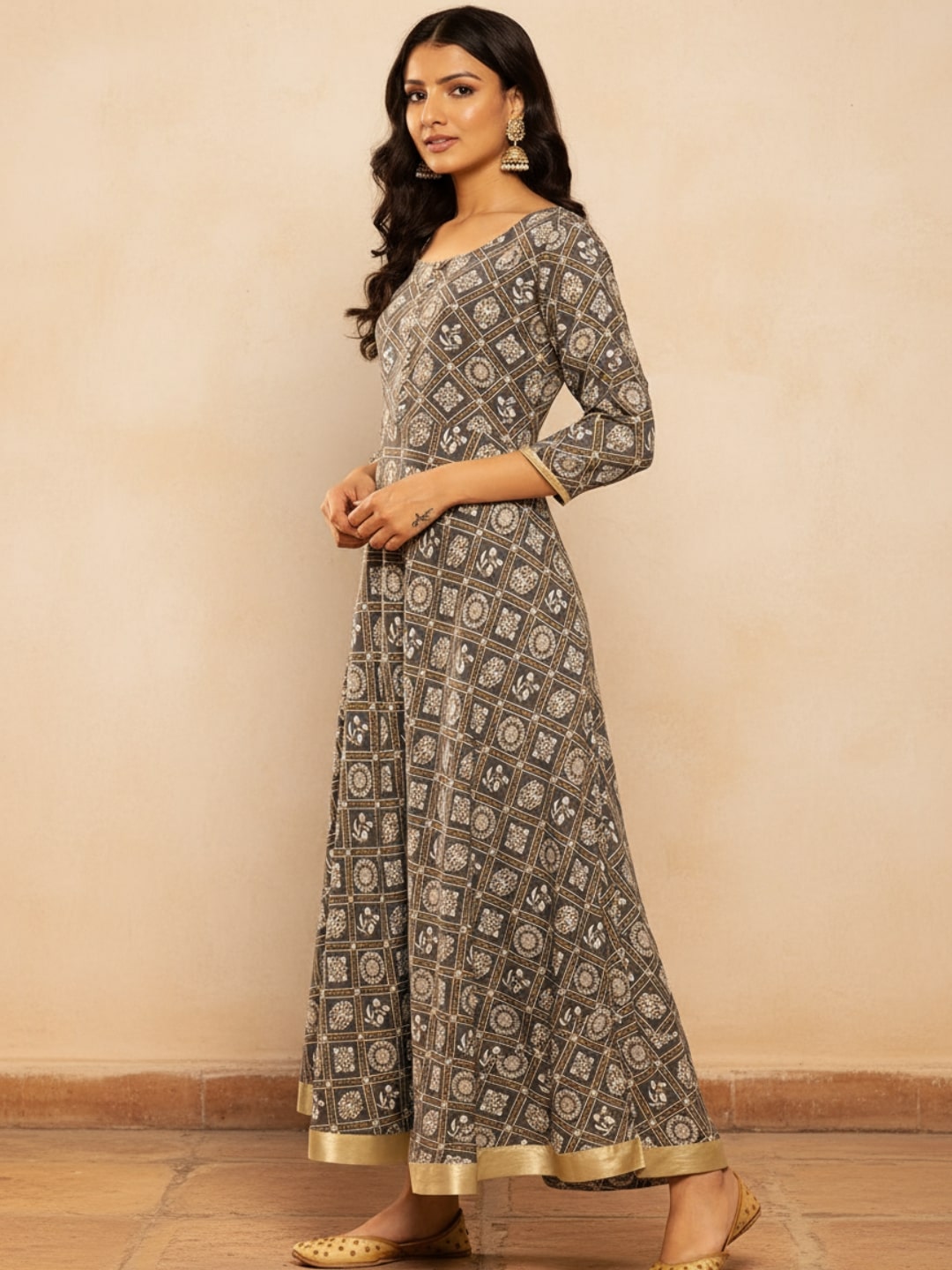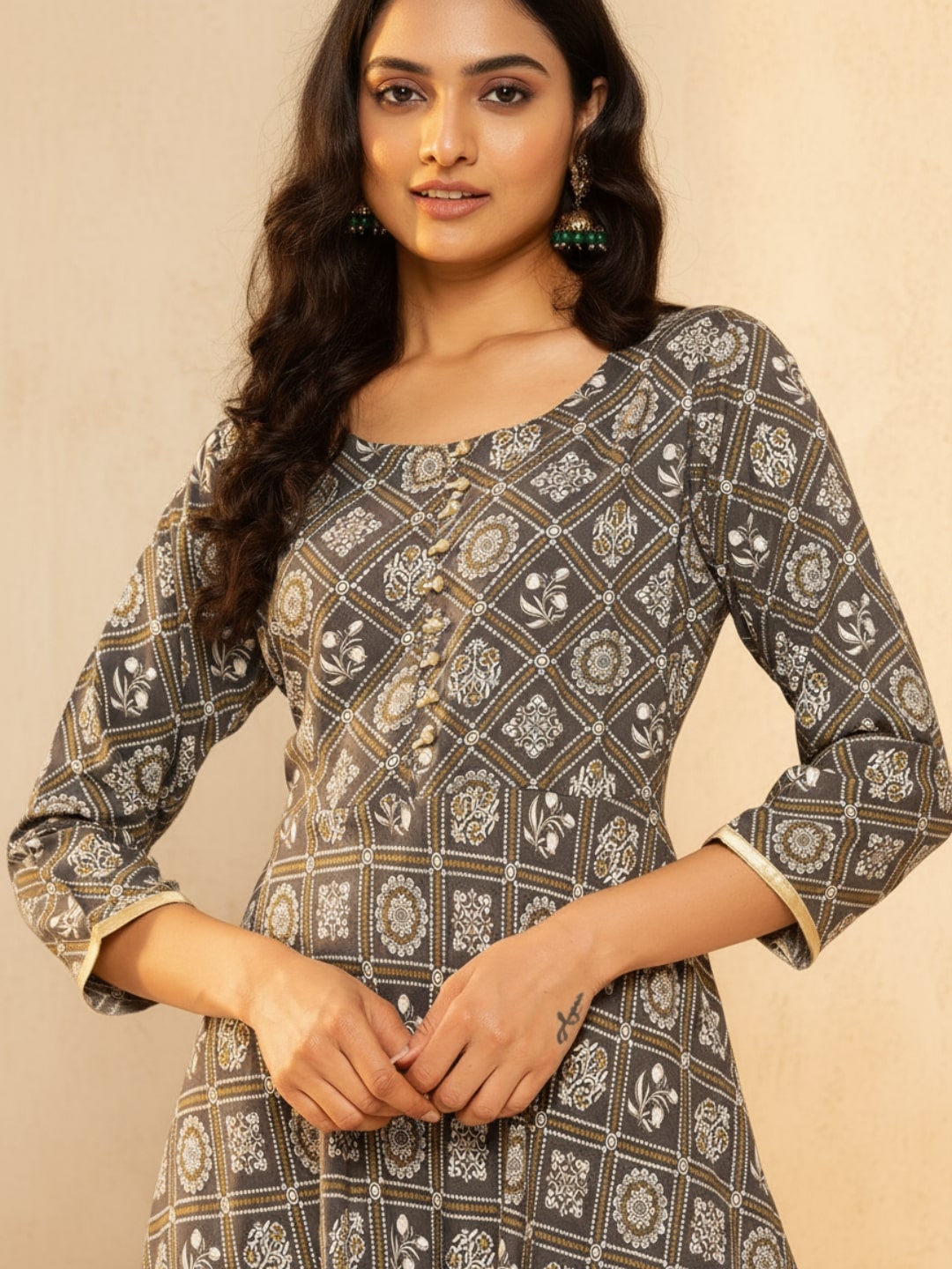 Our grey floral print fit and flare dress, crafted in soft rayon fabric features a round neckline, three-quarter sleeves and a flared hemline. Adorned with delicate fabric-trim accents, this charming style is perfect for casual outings.