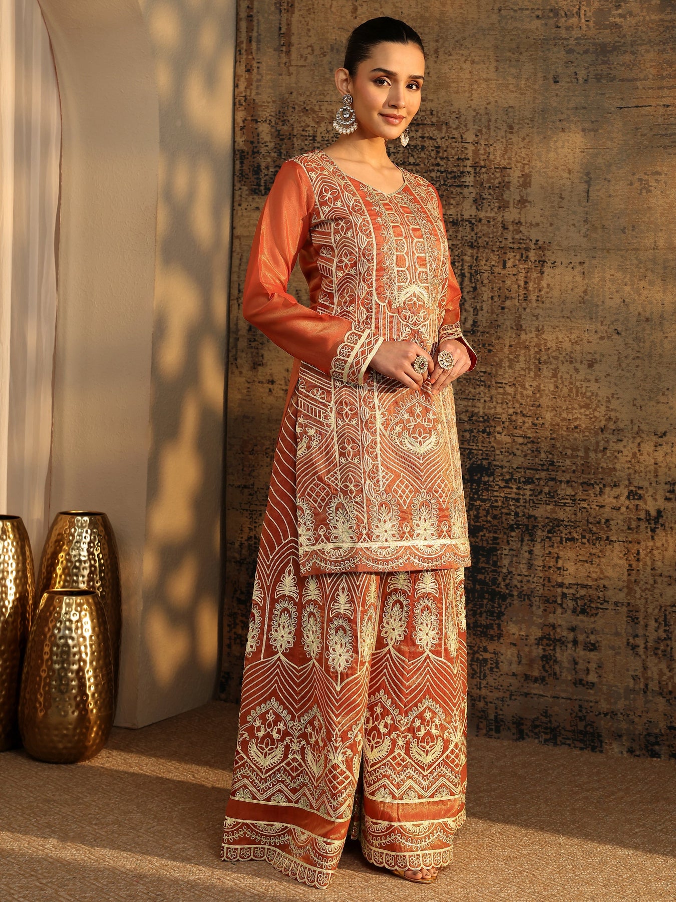 Libas Art Rust Embroidered Silk Blend Straight Suit Set With Dupatta
