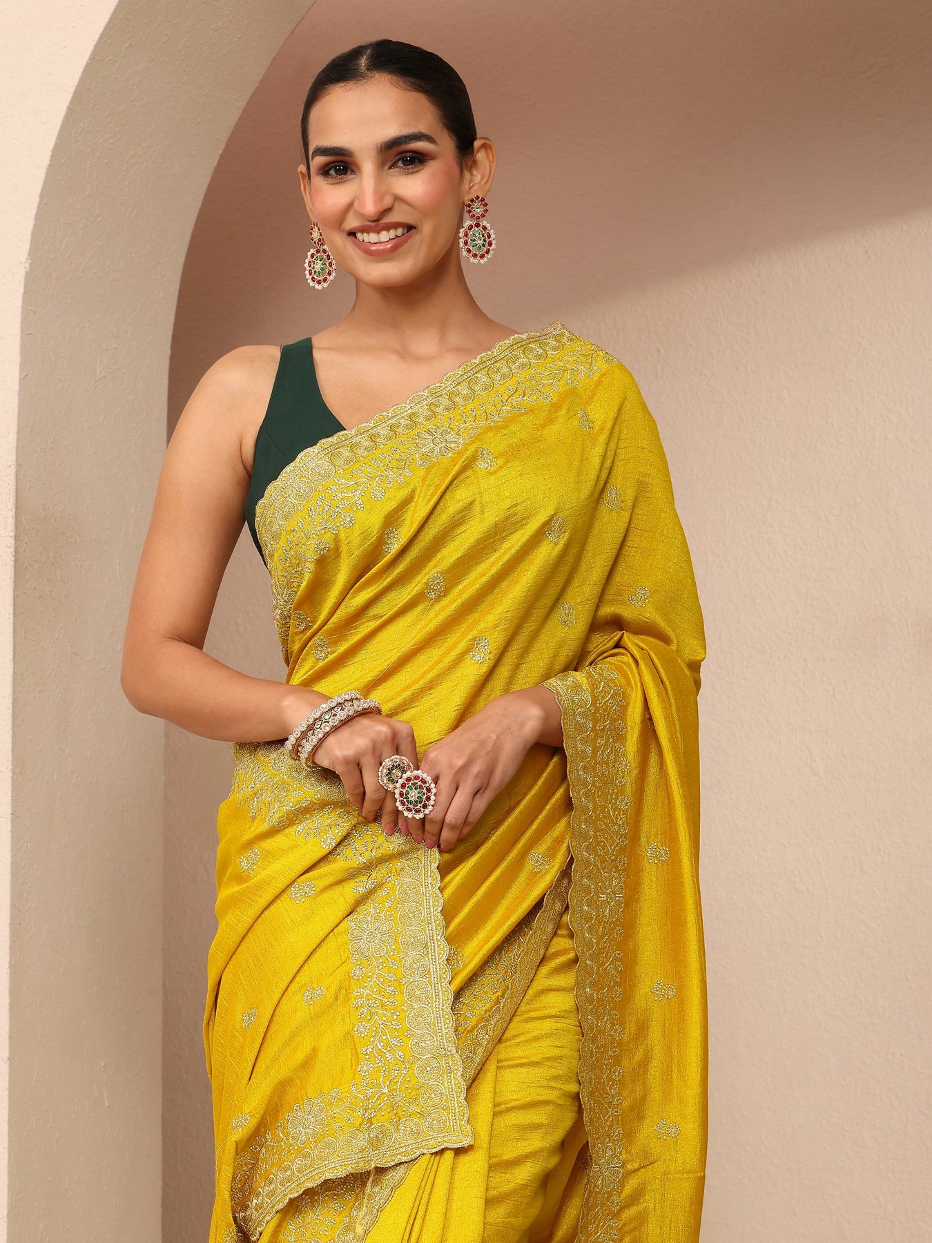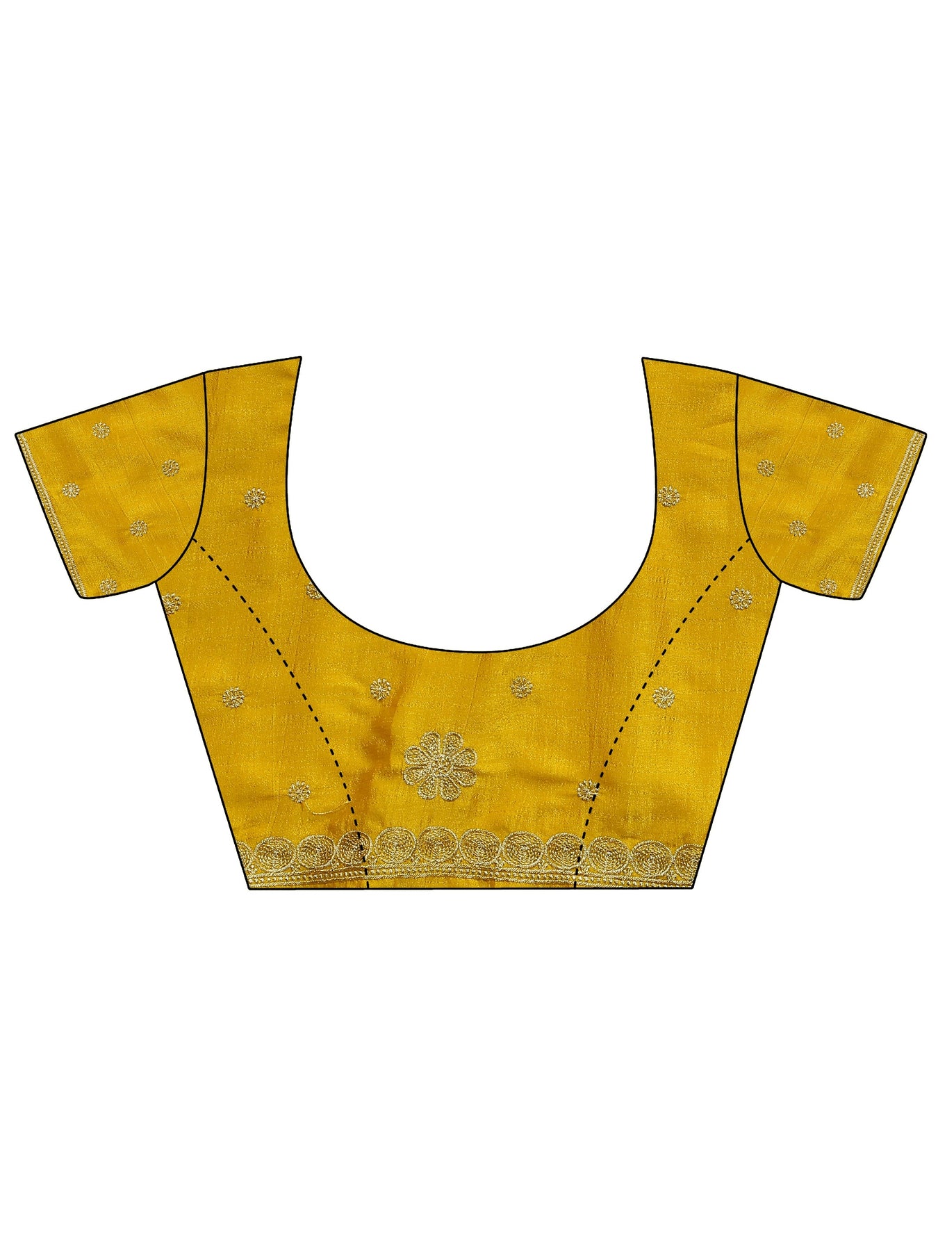 Our yellow silk blend saree features captivating embellishments. Complemented with an unstitched blouse piece. This charming saree is perfect for festive occasions.