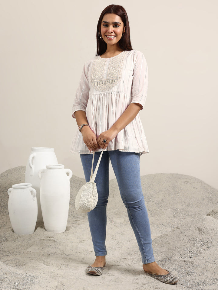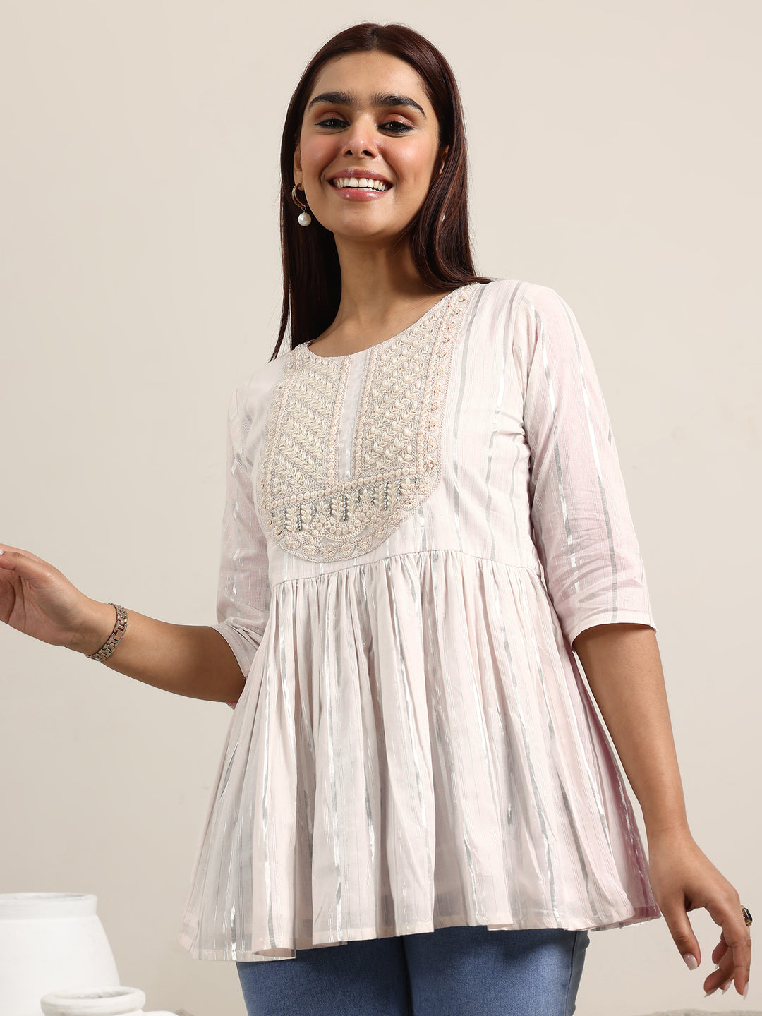 Our off white printed cotton Anarkali kurti features a round neckline, three-quarter sleeves, and a statement yoke. Highlighted with thread work and beaded accents, this style is perfect for light festivities.