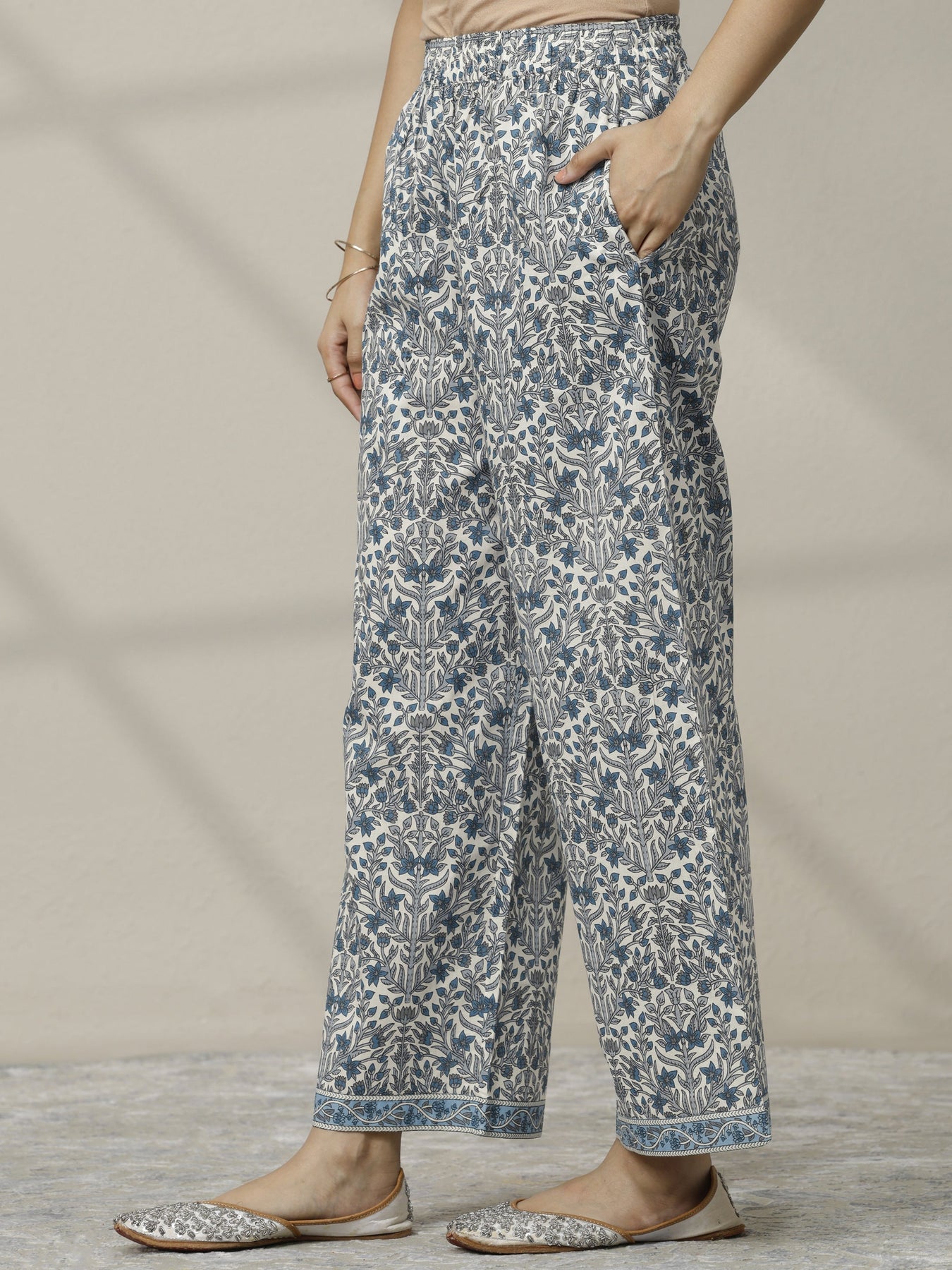 Our 3-piece Off White and Blue Cotton Straight-Fit Kurta Set features a V-Neckline, Regular Sleeves, and statement yoke. Complemented with Palazzo Pants with a Partially Elasticated waistband and 2 pockets, and a Printed dupatta. Adorned with floral printed, this style is perfect for Work Wear and Casual Wear.