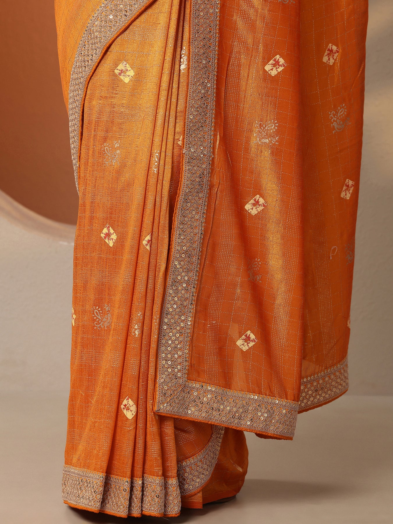 Orange Printed Silk Blend Saree With Unstitched Blouse Piece