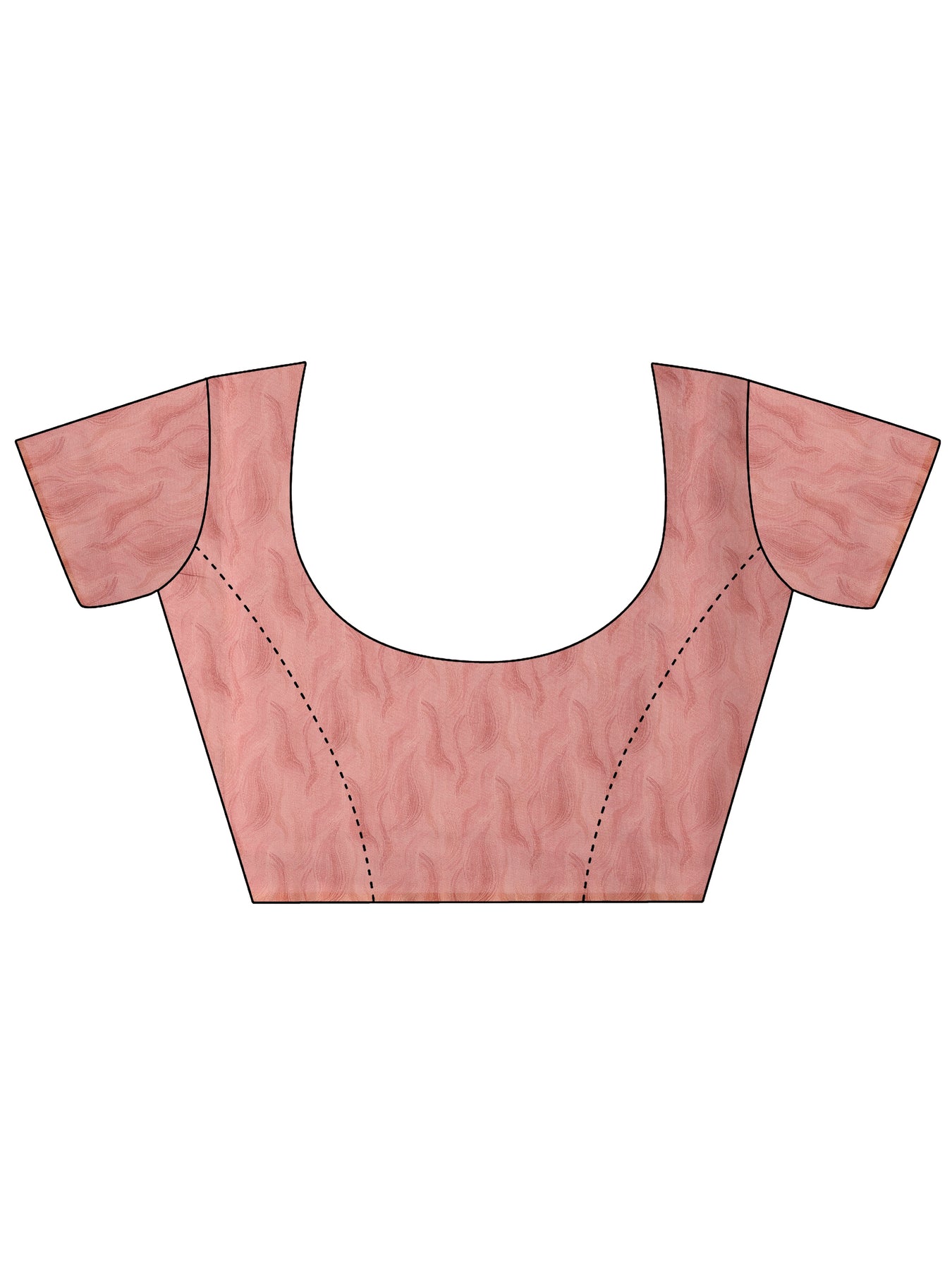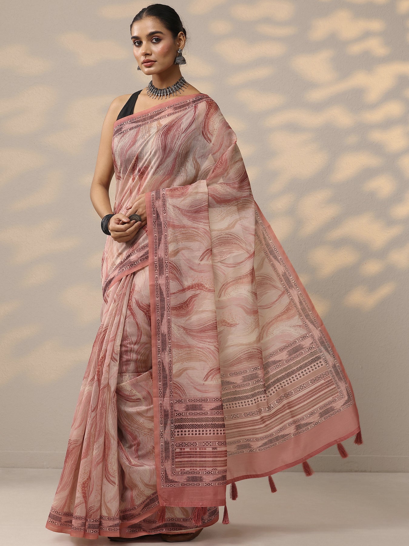 Peach Printed Silk Blend Saree With Unstitched Blouse Piece