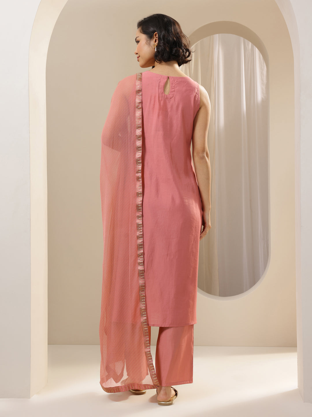 Peach Solid Silk Blend Straight Suit Sets With Dupatta