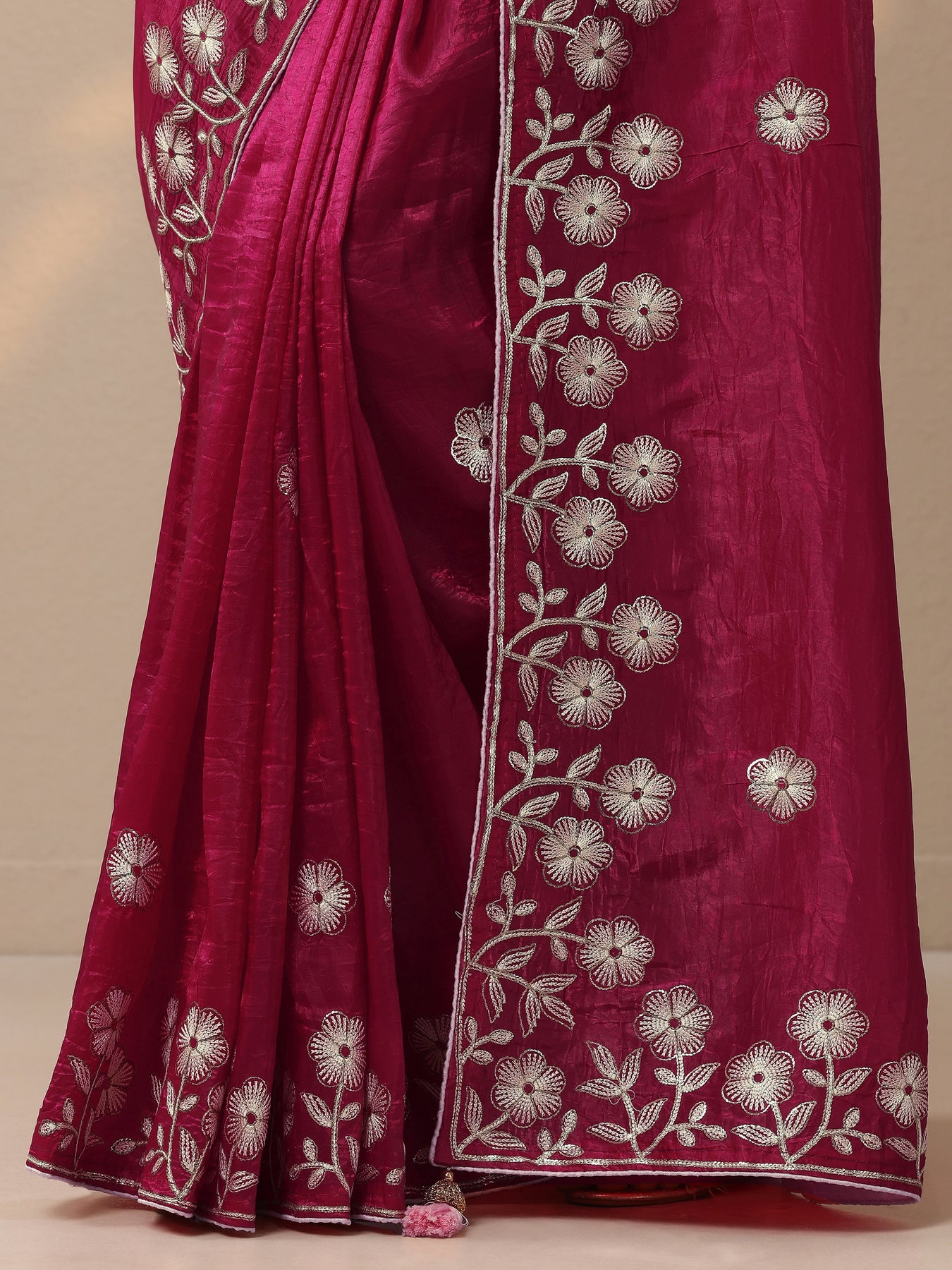 Our Magenta Printed Organza Saree Features Captivating Floral Print. Complemented With An Unstitched Blouse Piece. This Charming Saree Is Perfect For Festive Occasions