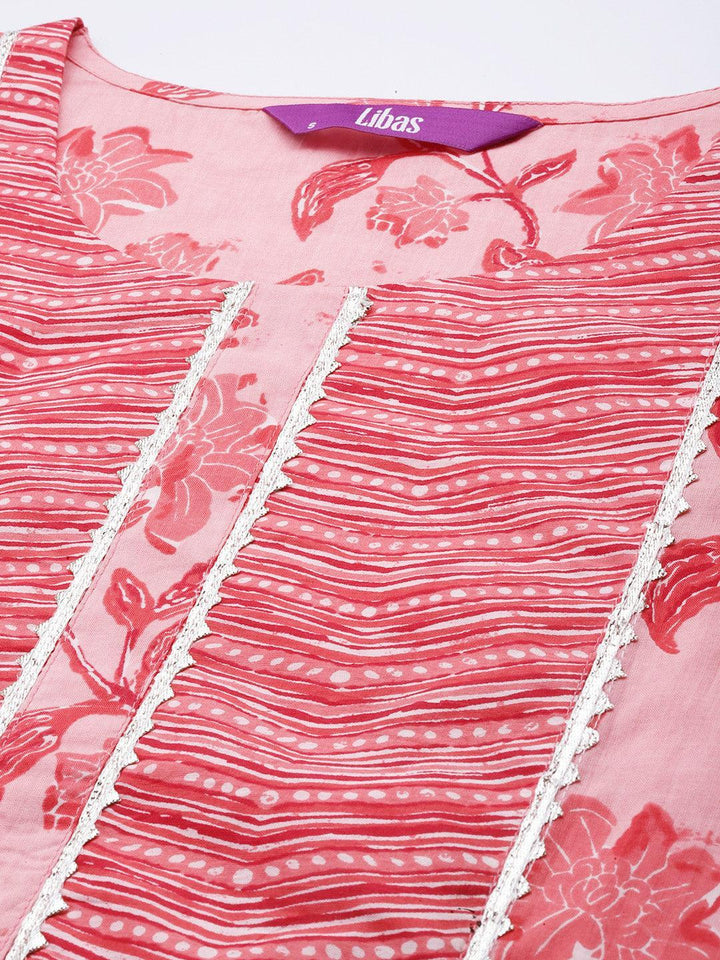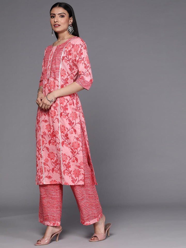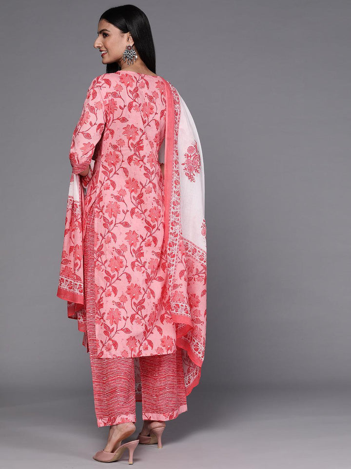 Our 3-piece pink printed cotton suit set features a straight-fit floral print kurta with a round neckline and a statement yoke, straight palazzo pants with a partially elasticated waistband and roomy pockets, and a dupatta in contrasting print. Adorned with delicate Gota Patti accents, this refreshing style is perfect for light festivities.