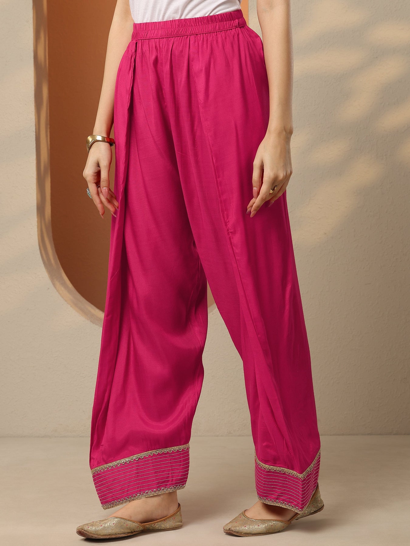Our 3-piece pink multi crepe straight-fit kurta set features a V-neckline, flared sleeves, and statement yoke. Complemented with salwar pants with a partially elasticated waistband and 2 pockets, and a printed dupatta. Adorned with Floral Printed, this style is perfect for festive occasions.