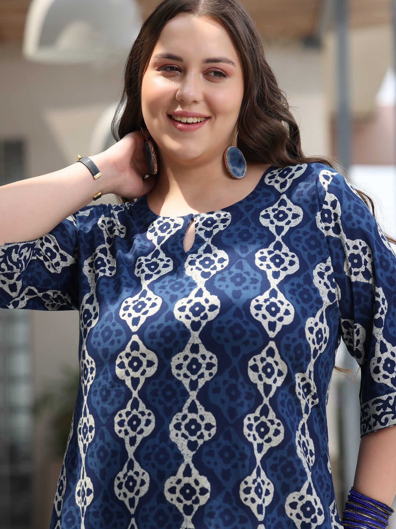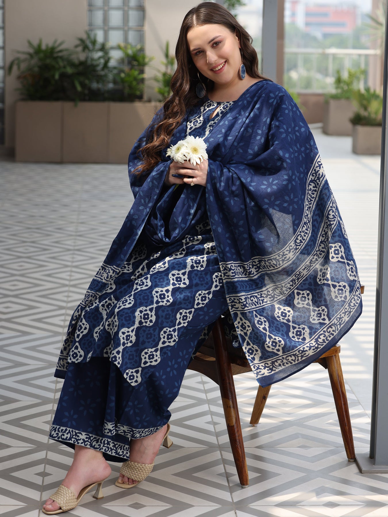Libas Extra Love collection features Libas Extra Love collection features our signature designs in comfortable plus sizes. Our 3-piece Navy Blue Cotton Straight-Fit Kurta Set features a Round Neckline, Regular Sleeves, and statement yoke. Complemented with Palazzo Pants with an Elasticated waistband and a Printed dupatta. Adorned with Printed accents, this style is perfect for Casual occasions.