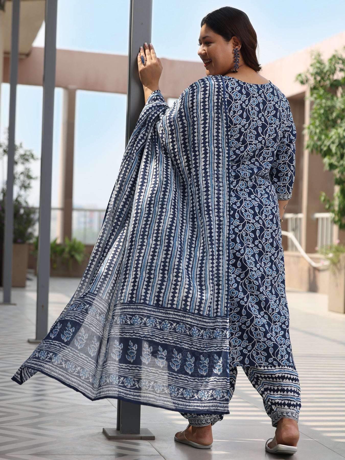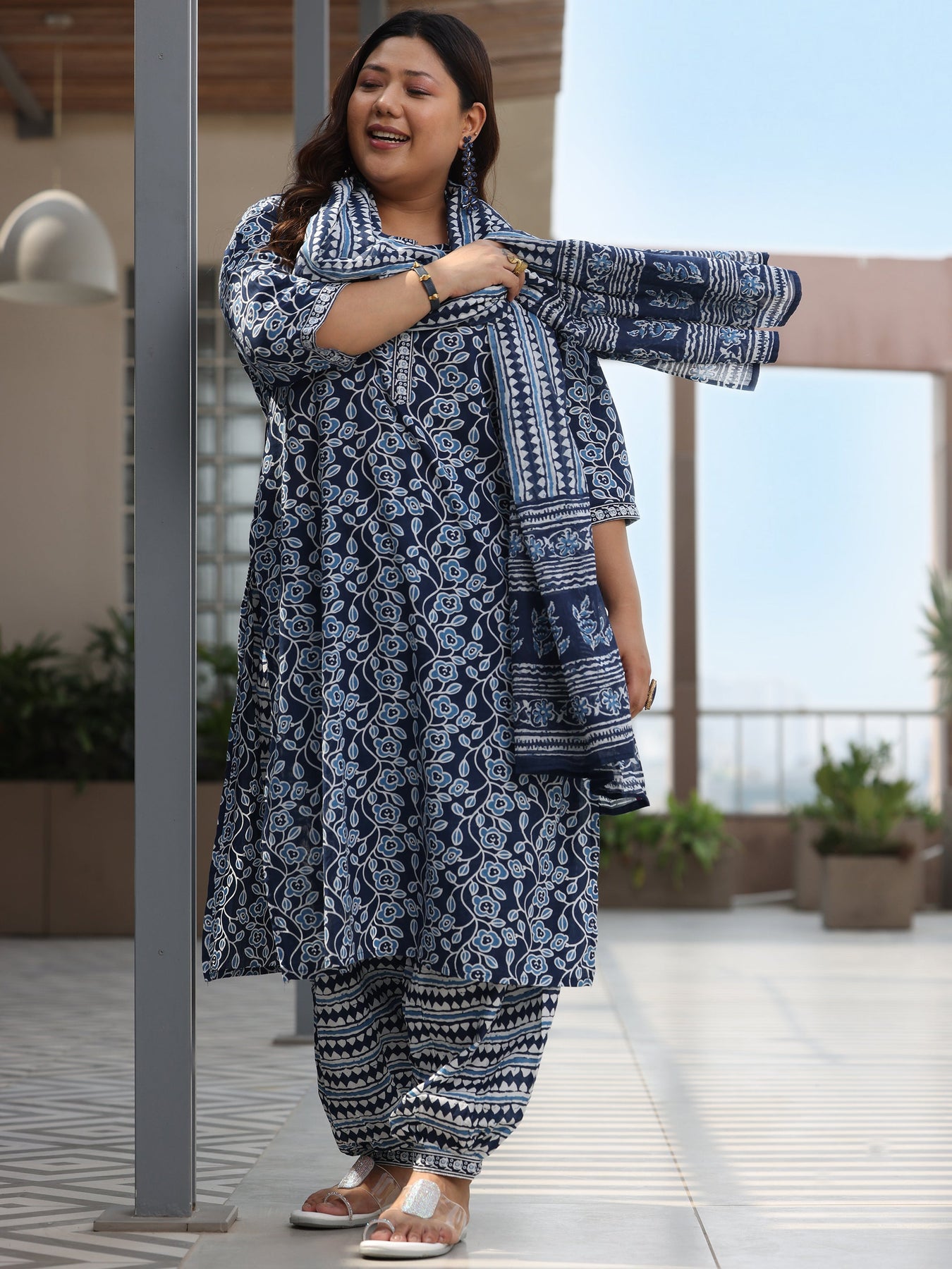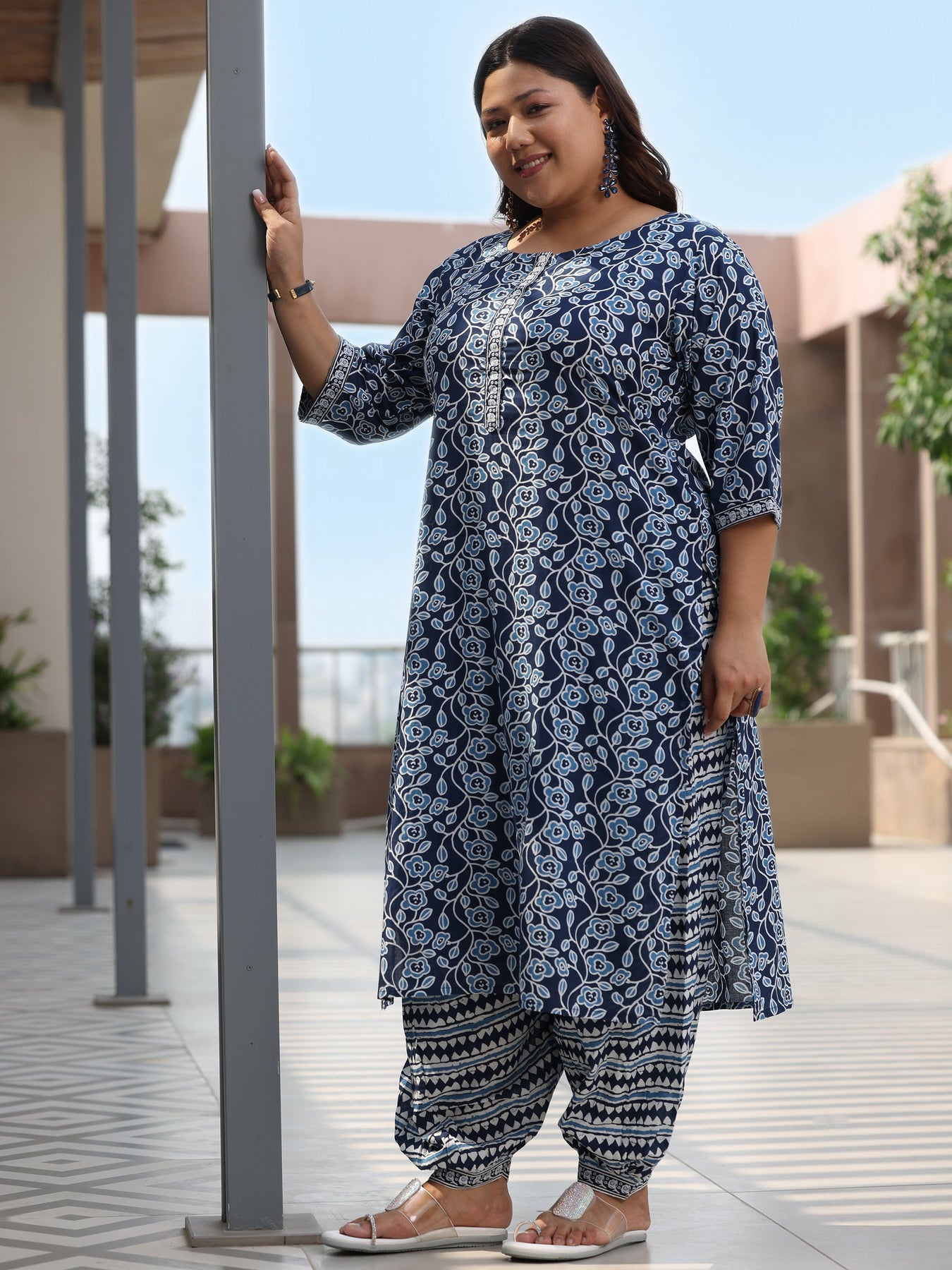 Libas Extra Love collection features our signature designs in comfortable plus sizes. Our 3-piece blue printed cotton straight suit set features a kurta with a round neckline and three-quarter sleeves. Complemented with Salwar trousers with a fully elasticated waistband and a dupatta. Highlighted with fabric-trim detailing, this style is perfect for elevated everyday wear.