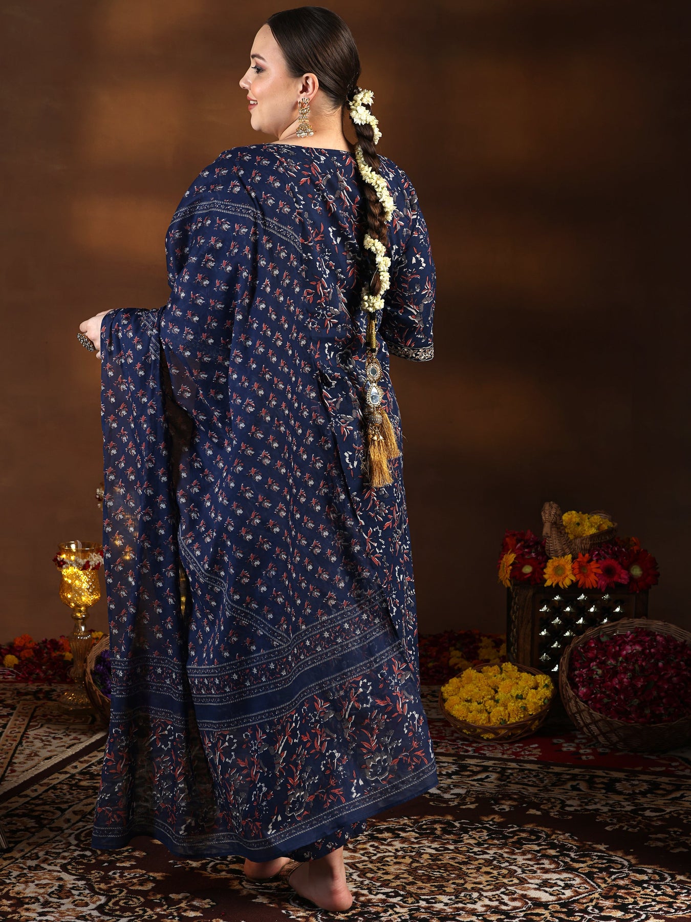 Plus Size Blue Printed Cotton Straight Suit With Dupatta