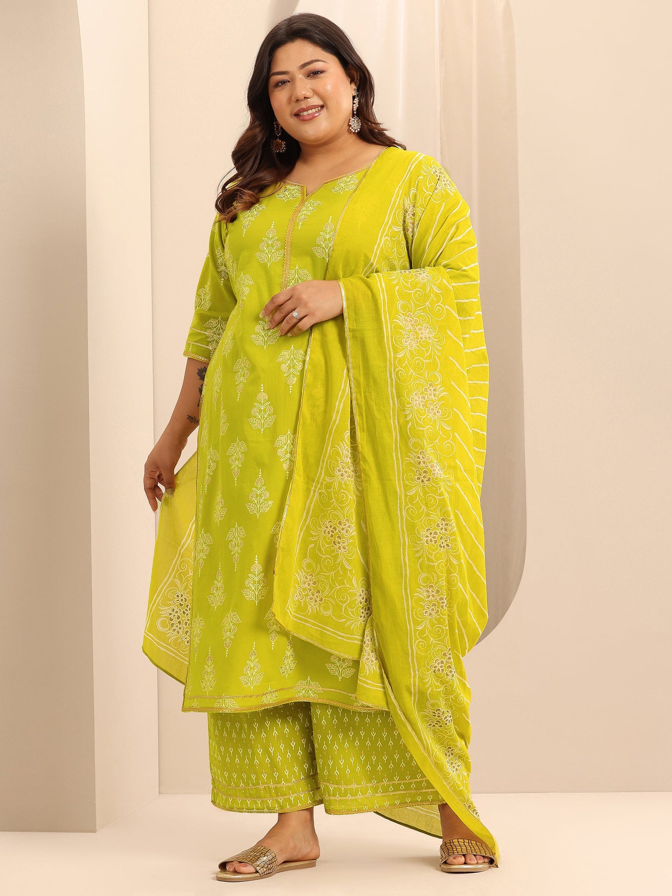 Plus Size Green Printed Cotton Straight Suit Set With Dupatta