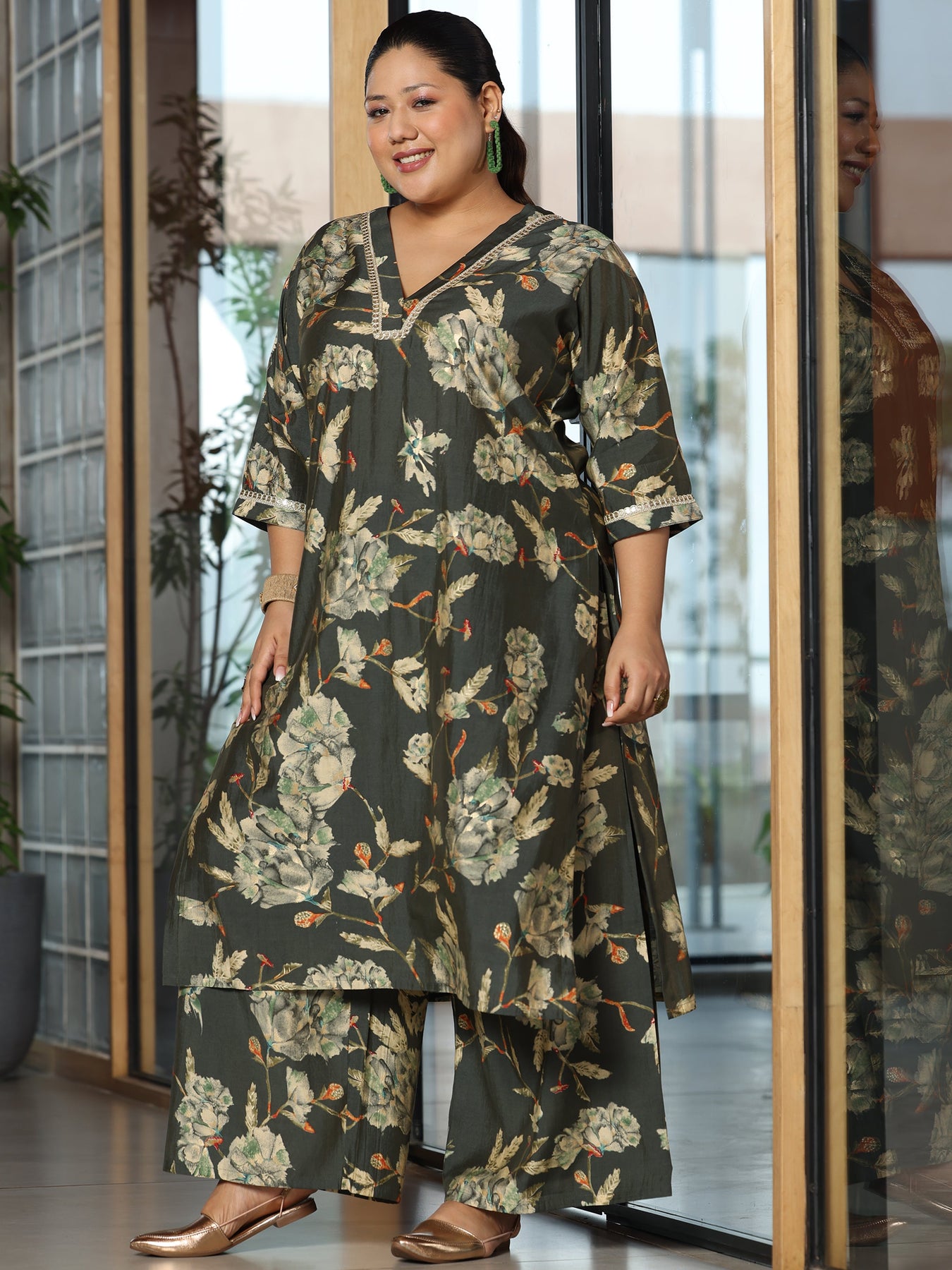 Our 2-piece grey printed silk blend kurta set features a straight-fit kurta with a V-neckline and three-quarter sleeves. Complemented with trousers with a partially elasticated waistband and roomy pockets. Highlighted with Gota Patti detailing, this style is perfect for casual outings.