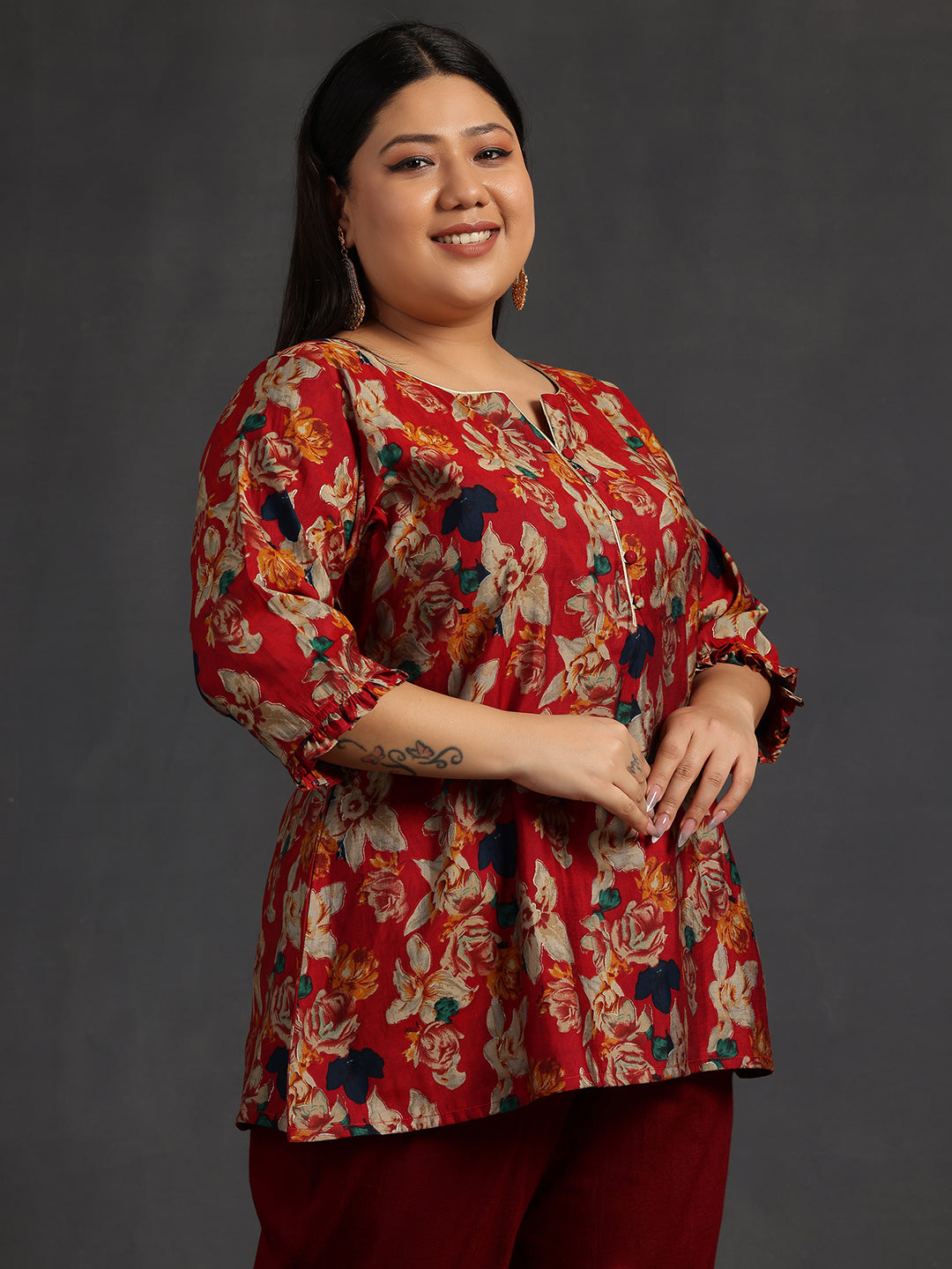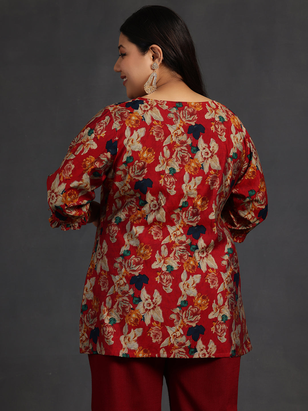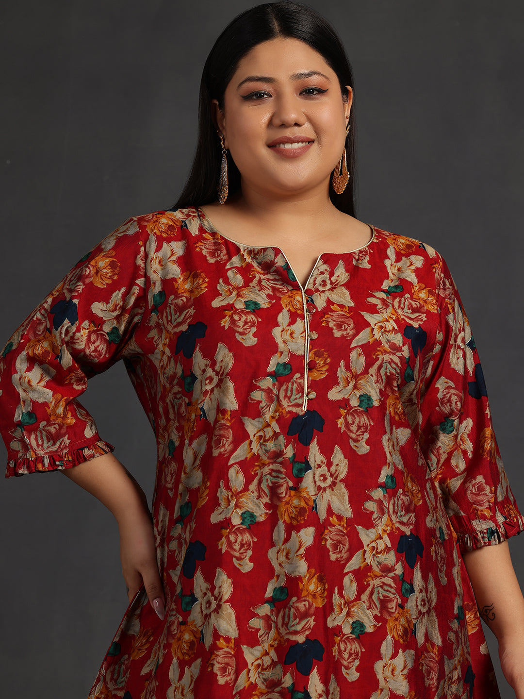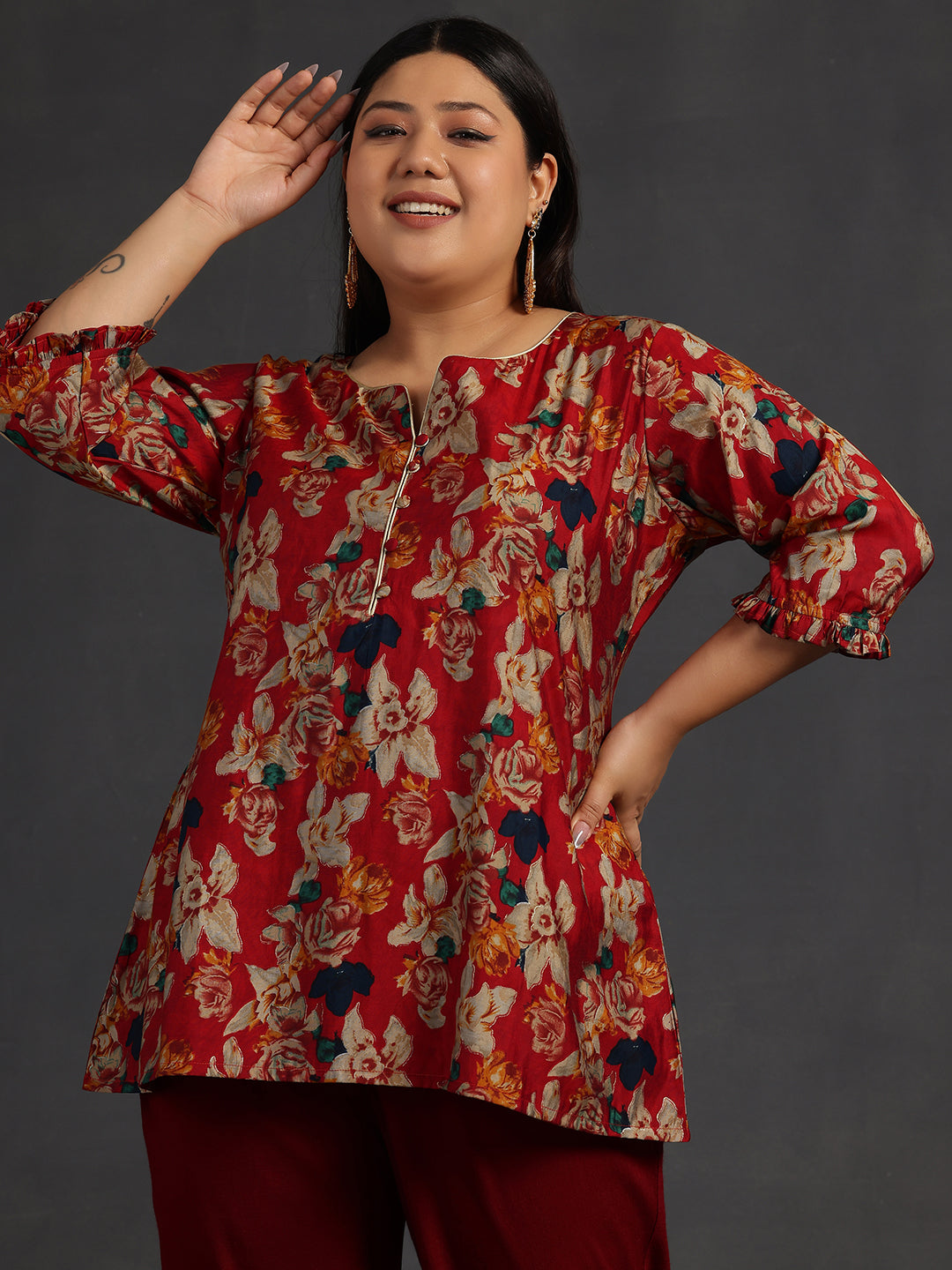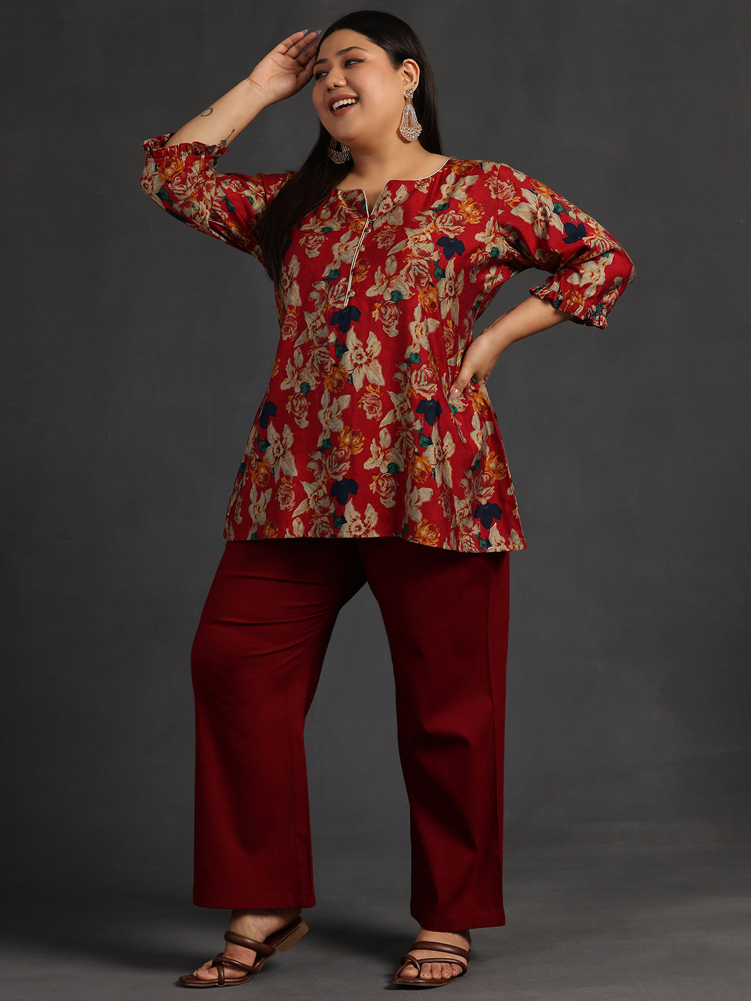 Plus Size Maroon Printed Silk Blend A-Line Kurti