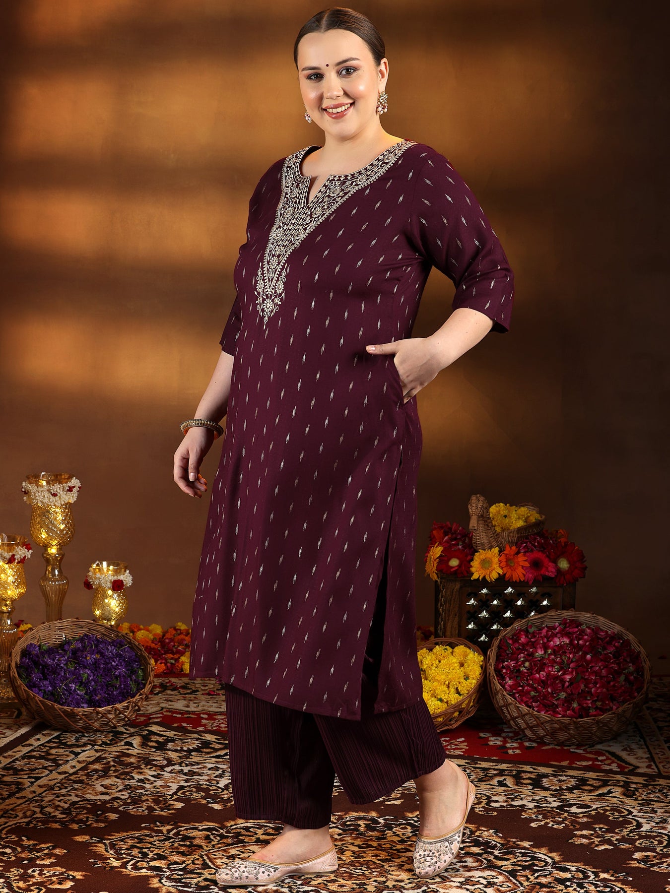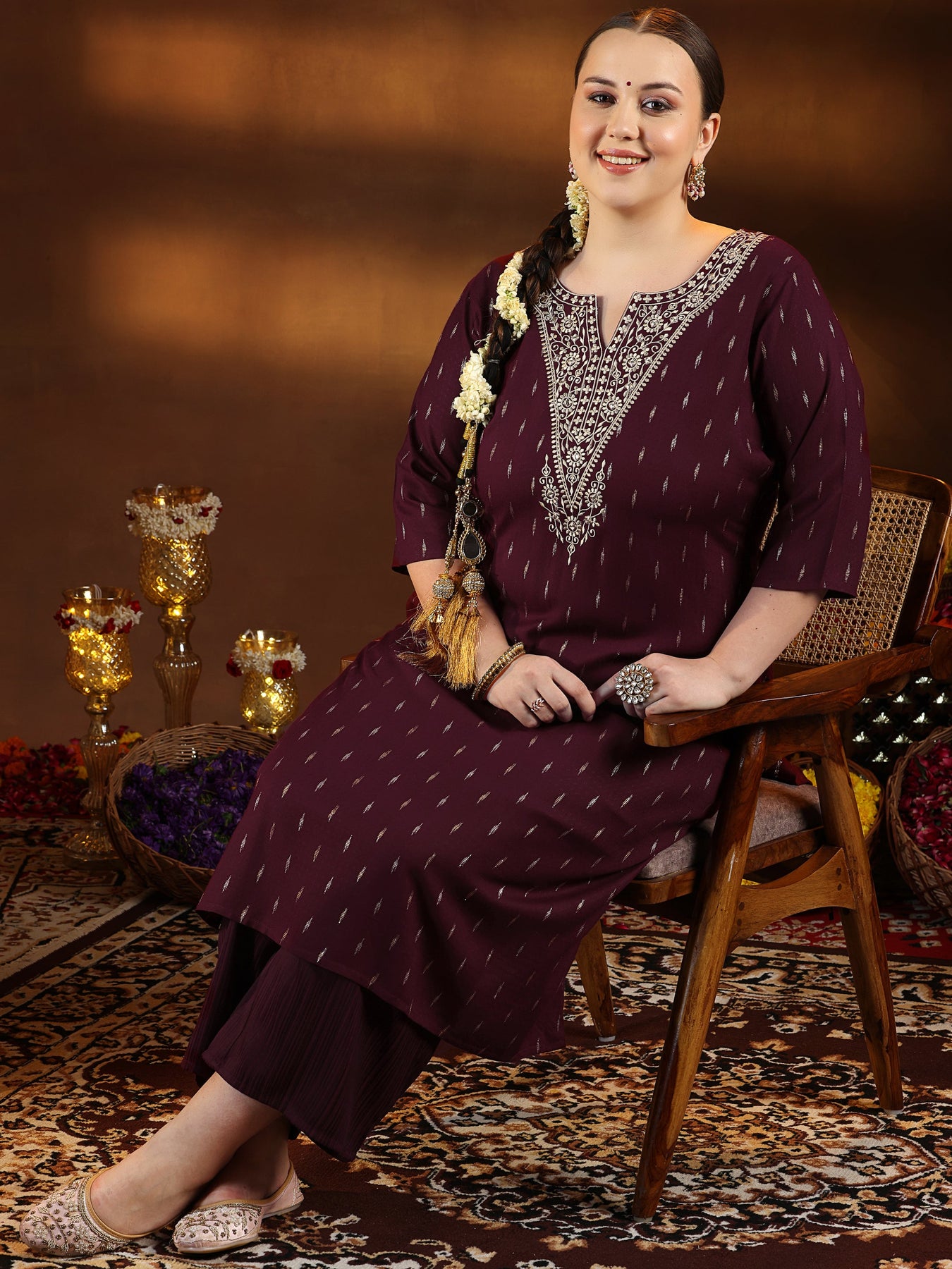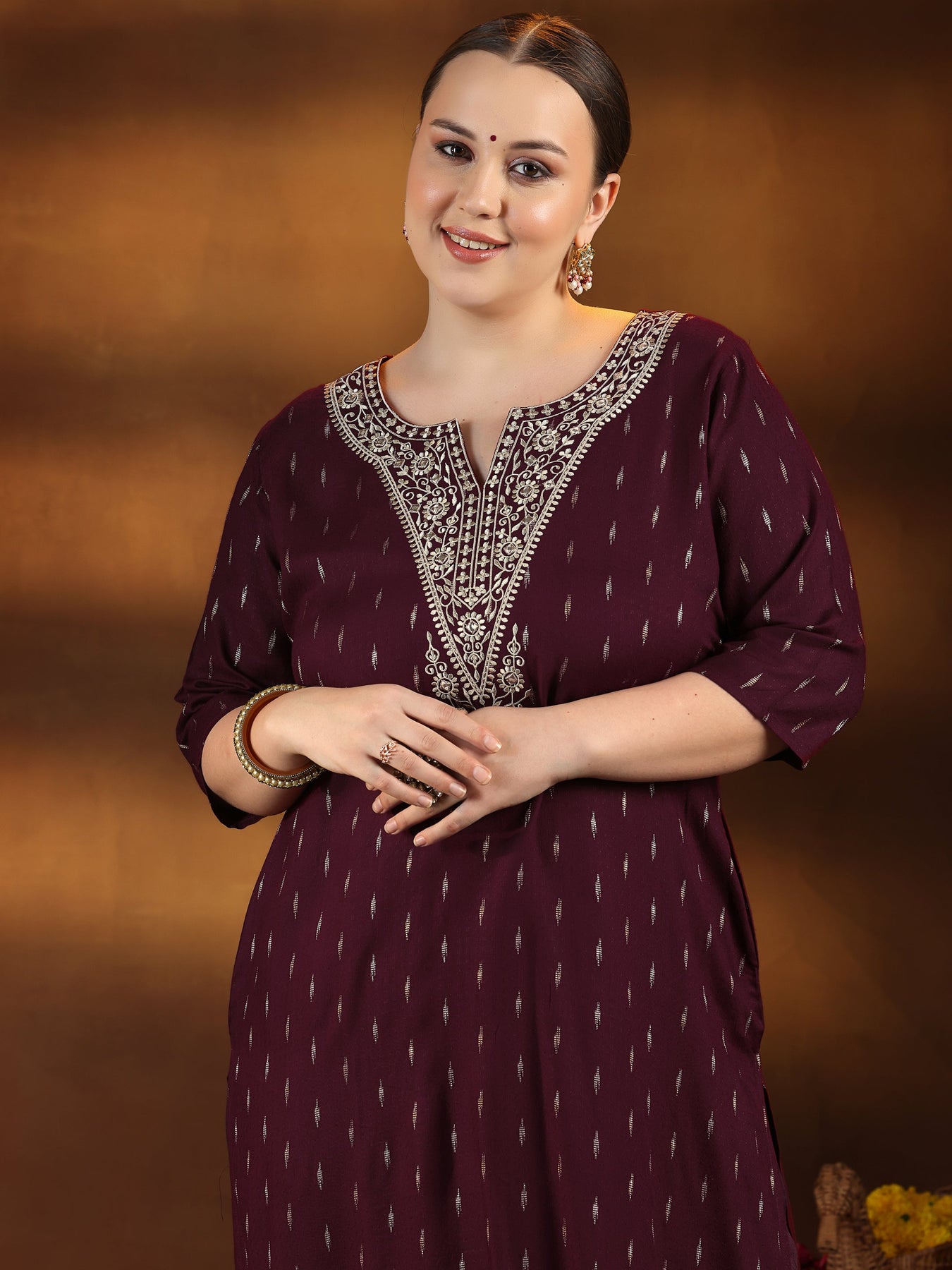 Plus Size Maroon Woven Design Cotton Straight Kurta