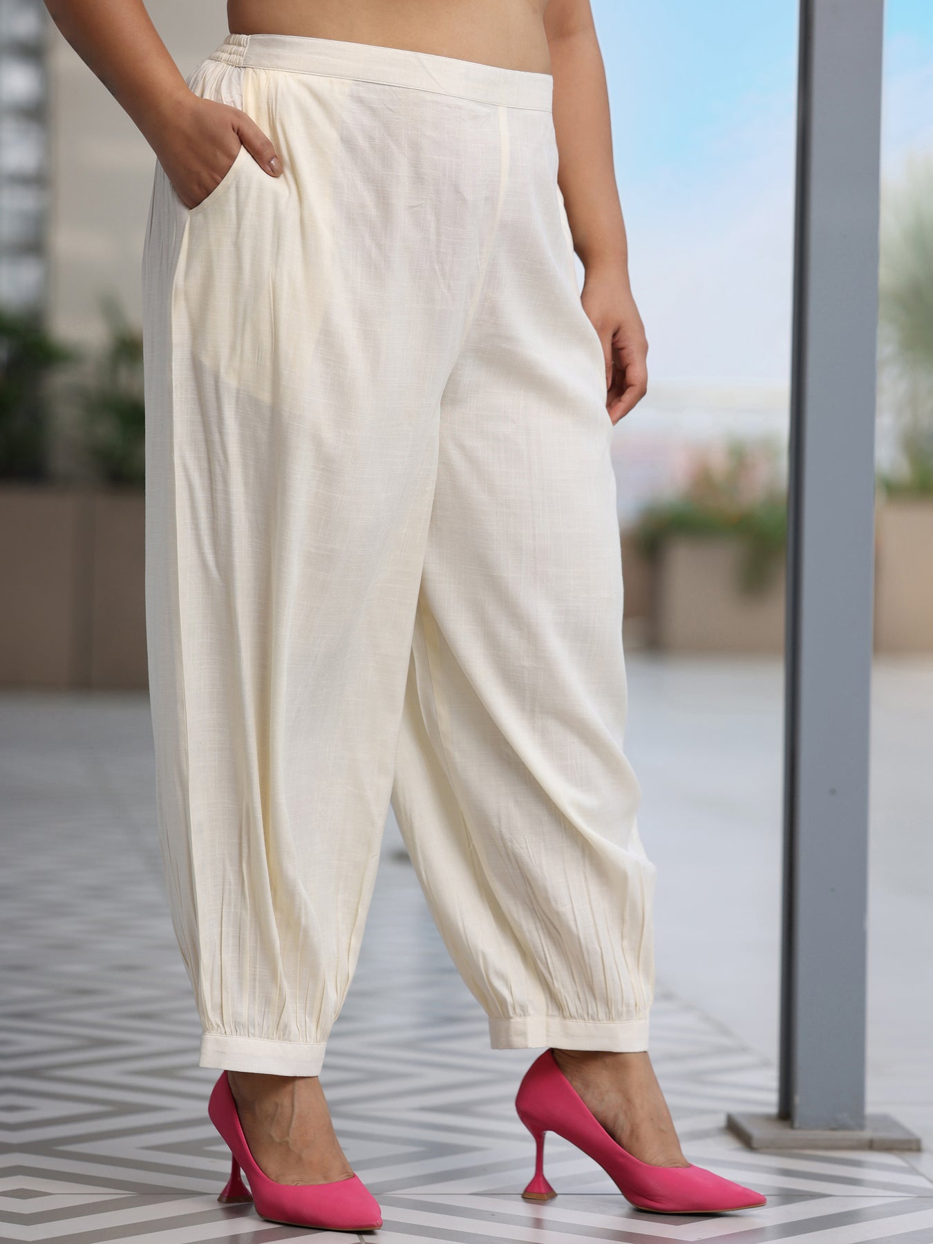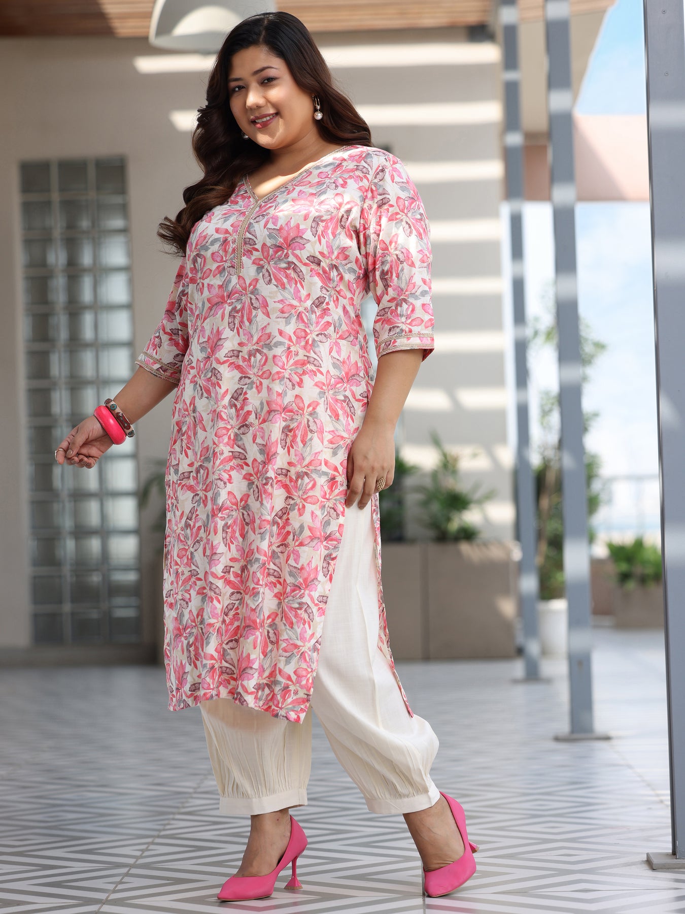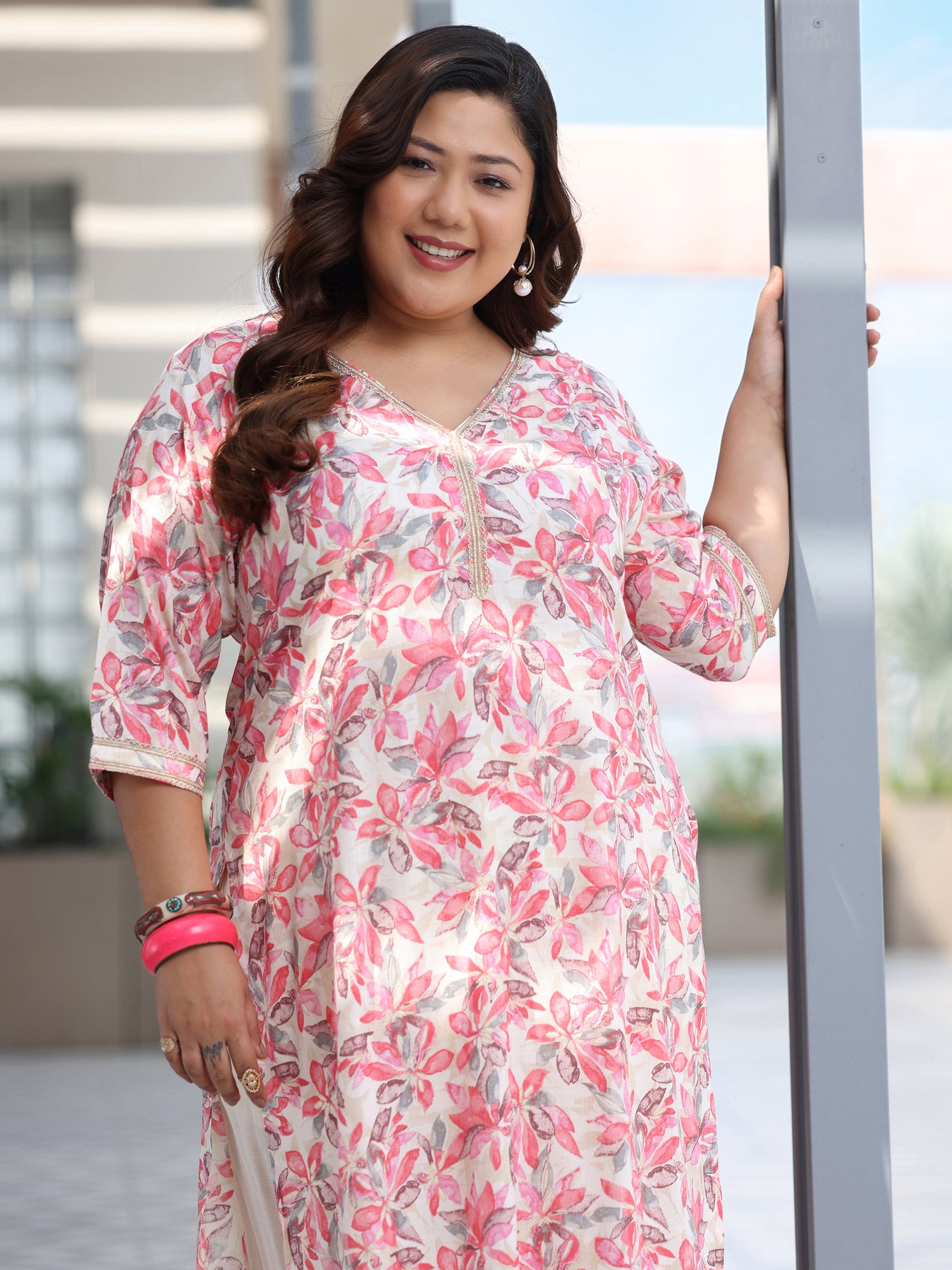 Libas Extra Love collection features our signature designs in comfortable plus sizes. Our 3-piece pink printed cotton blend straight suit set features a kurta with a V-neckline and three-quarter sleeves. Complemented with Salwar trousers with a partially elasticated waistband and roomy pockets, and a dupatta. Highlighted with Gota Patti detailing, this style is perfect for casual outings.