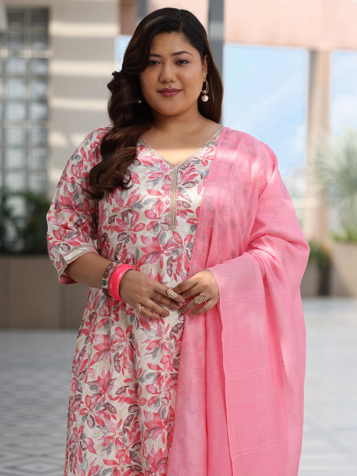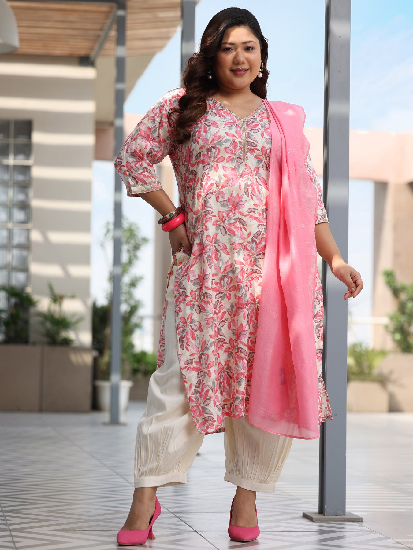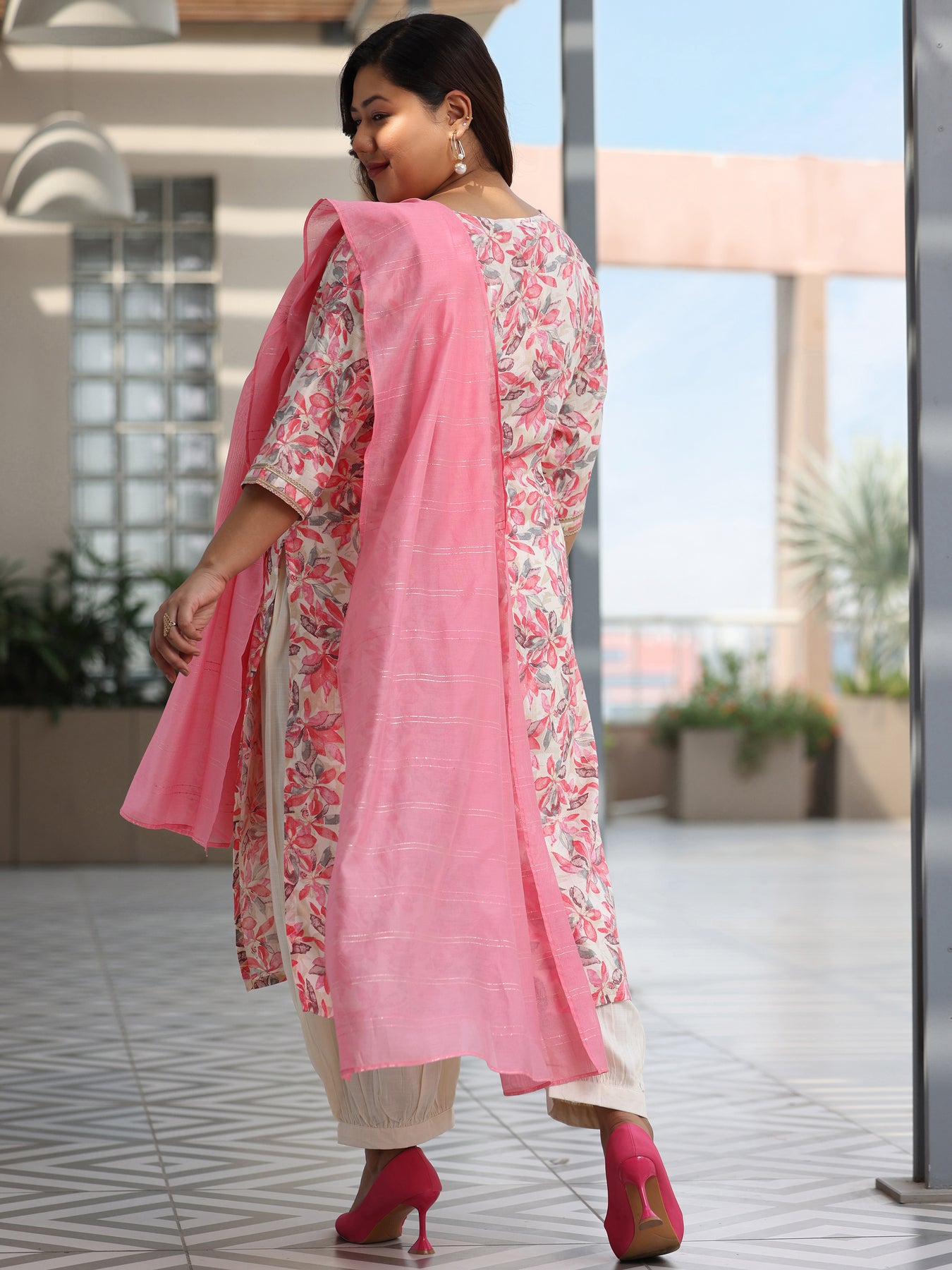 Plus Size Pink Printed Cotton Blend Straight Suit With Dupatta