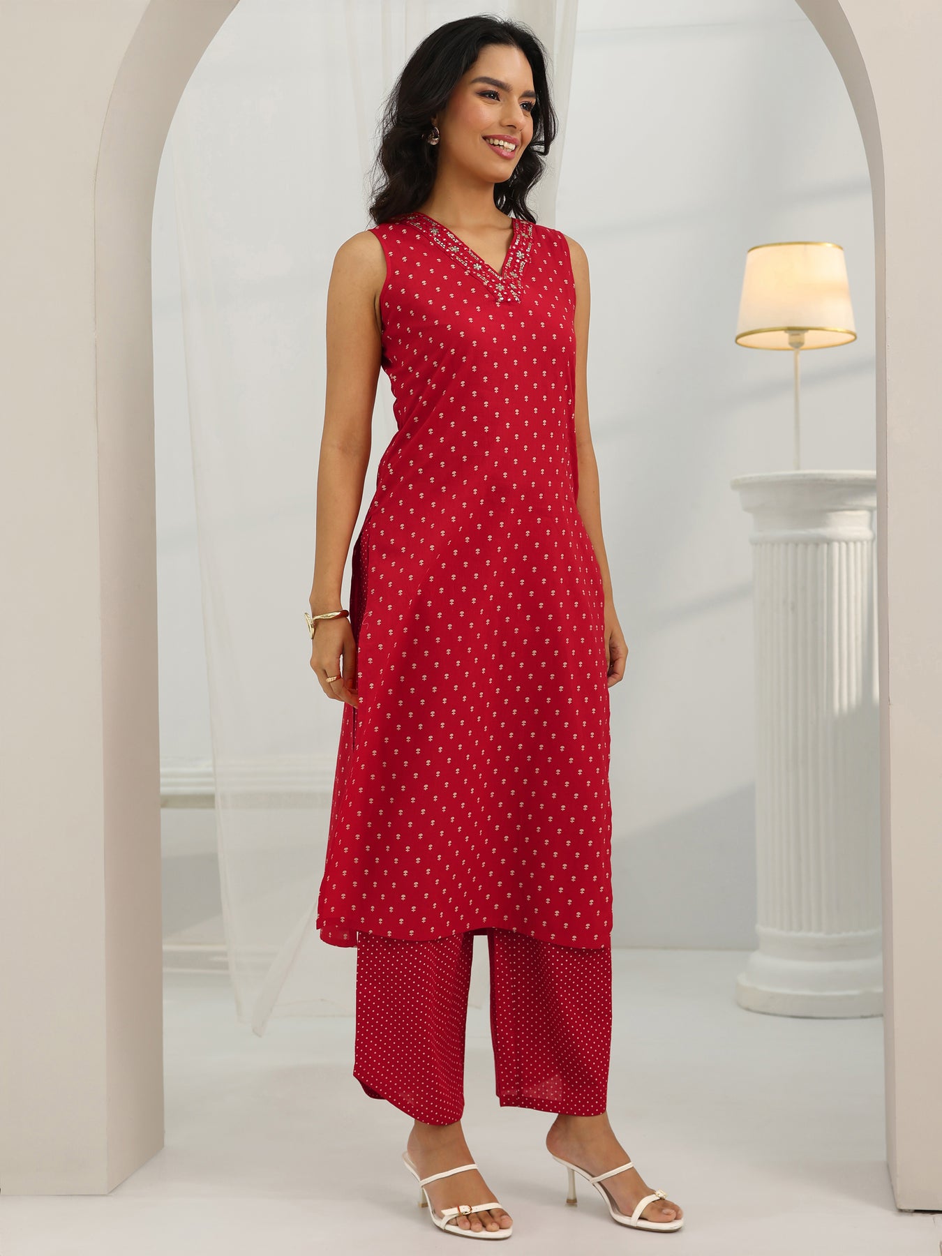 Red Printed Cotton Straight Suit Set With Dupatta