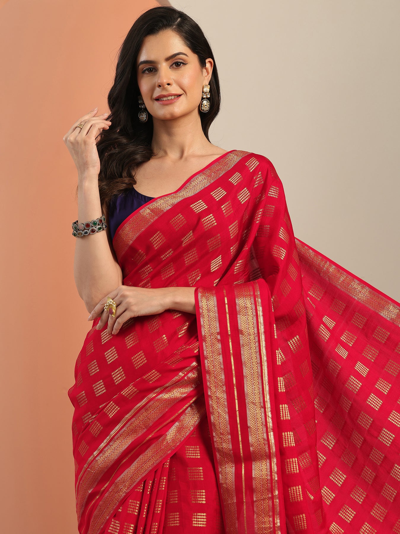 Our Red Printed Silk Blend Saree Features Captivating Woven Design. Complemented With A Unstitched Blouse Piece. This Charming Saree Is Perfect For Festive Wear.