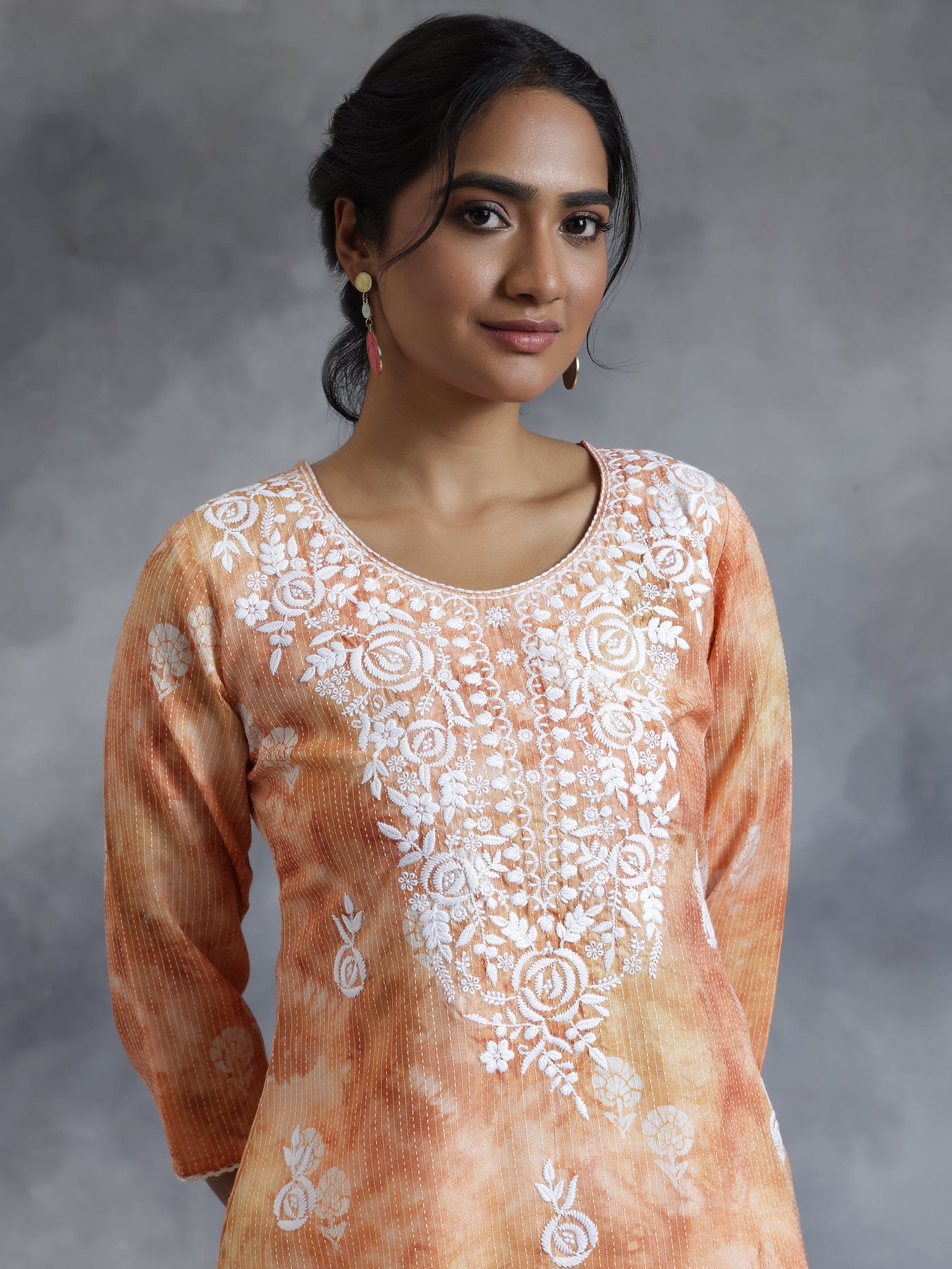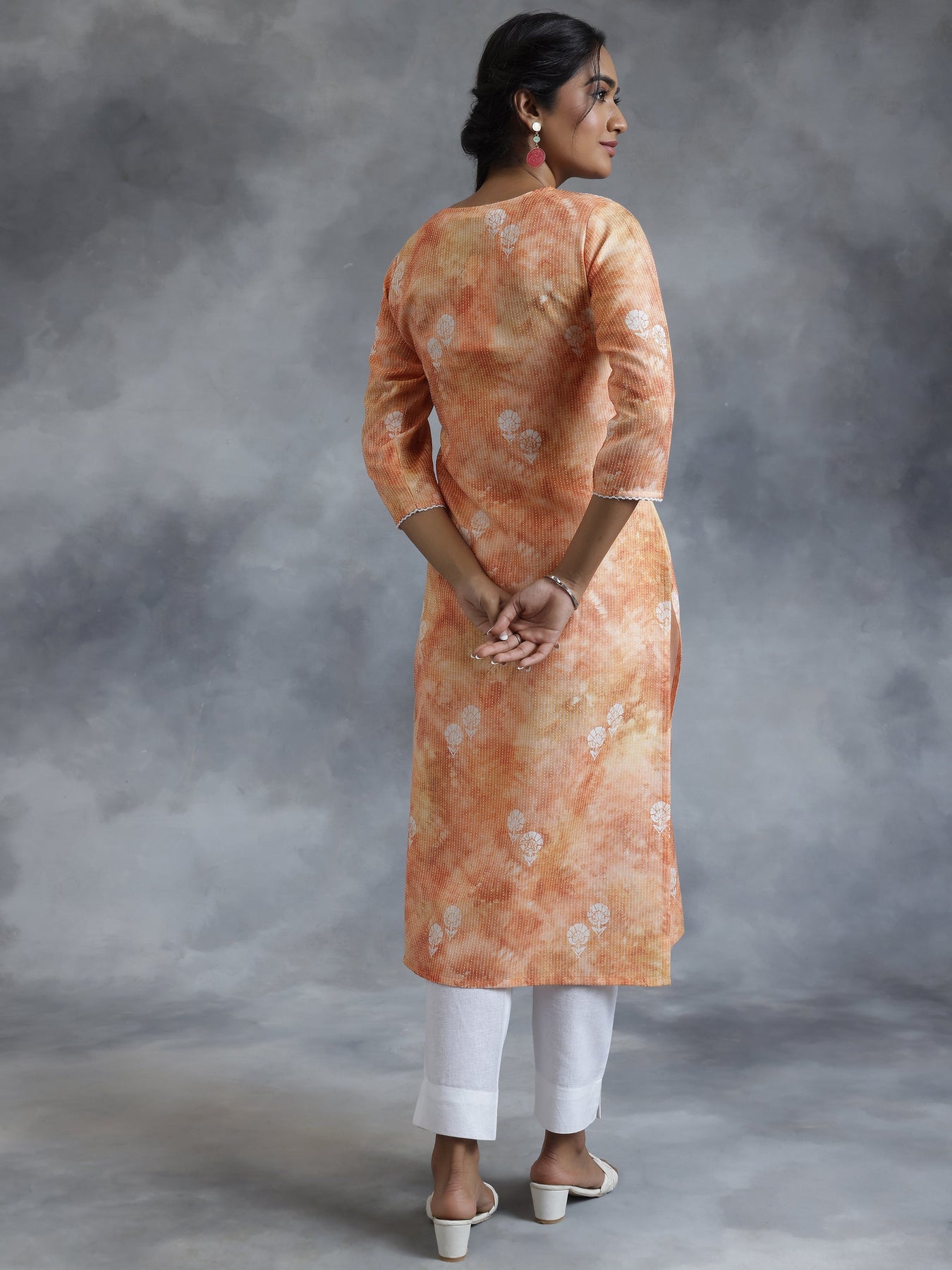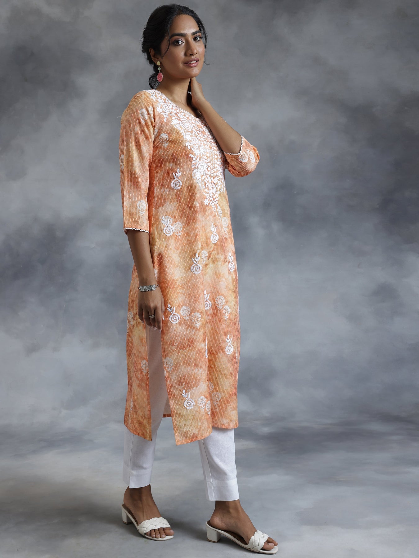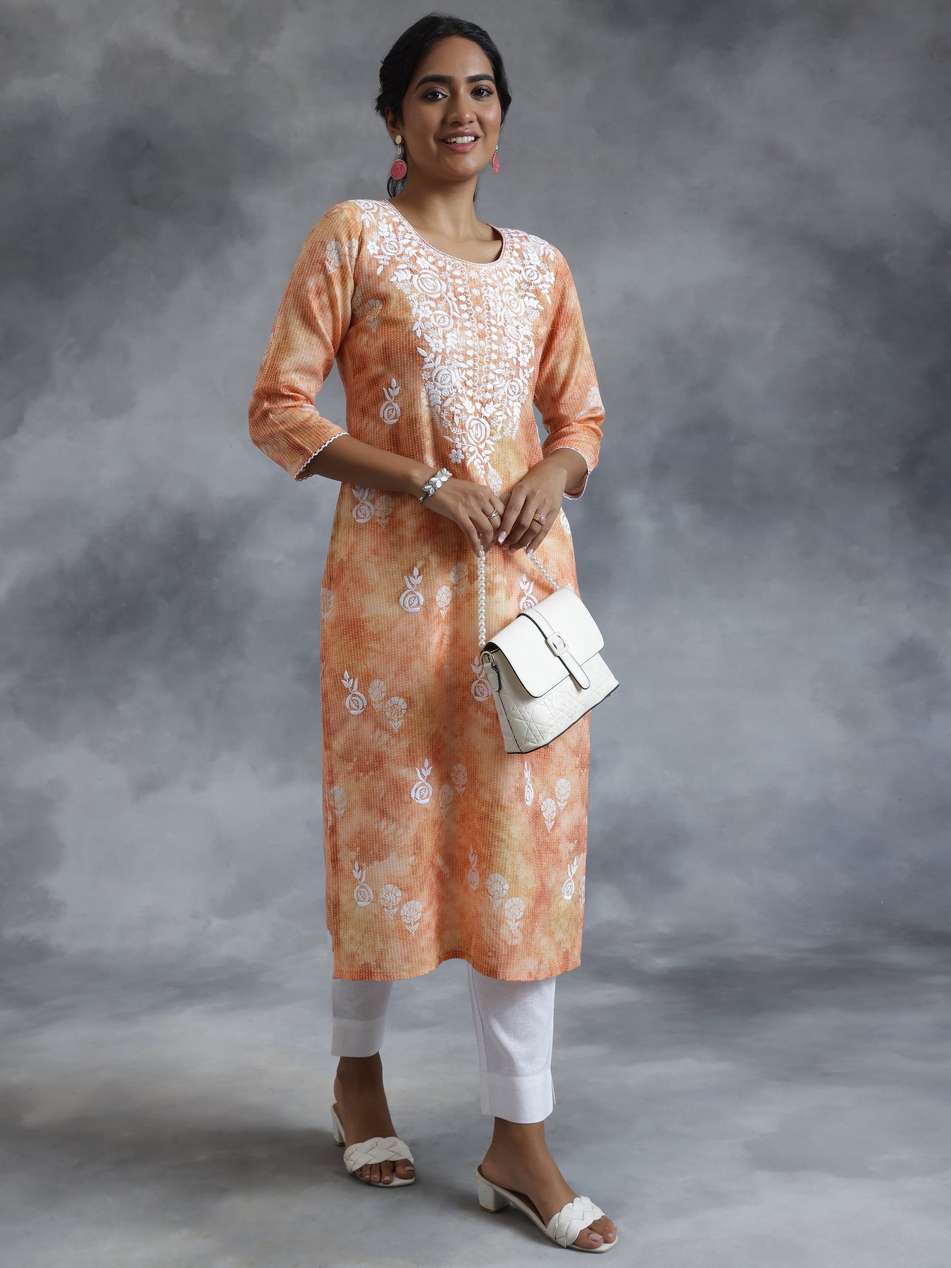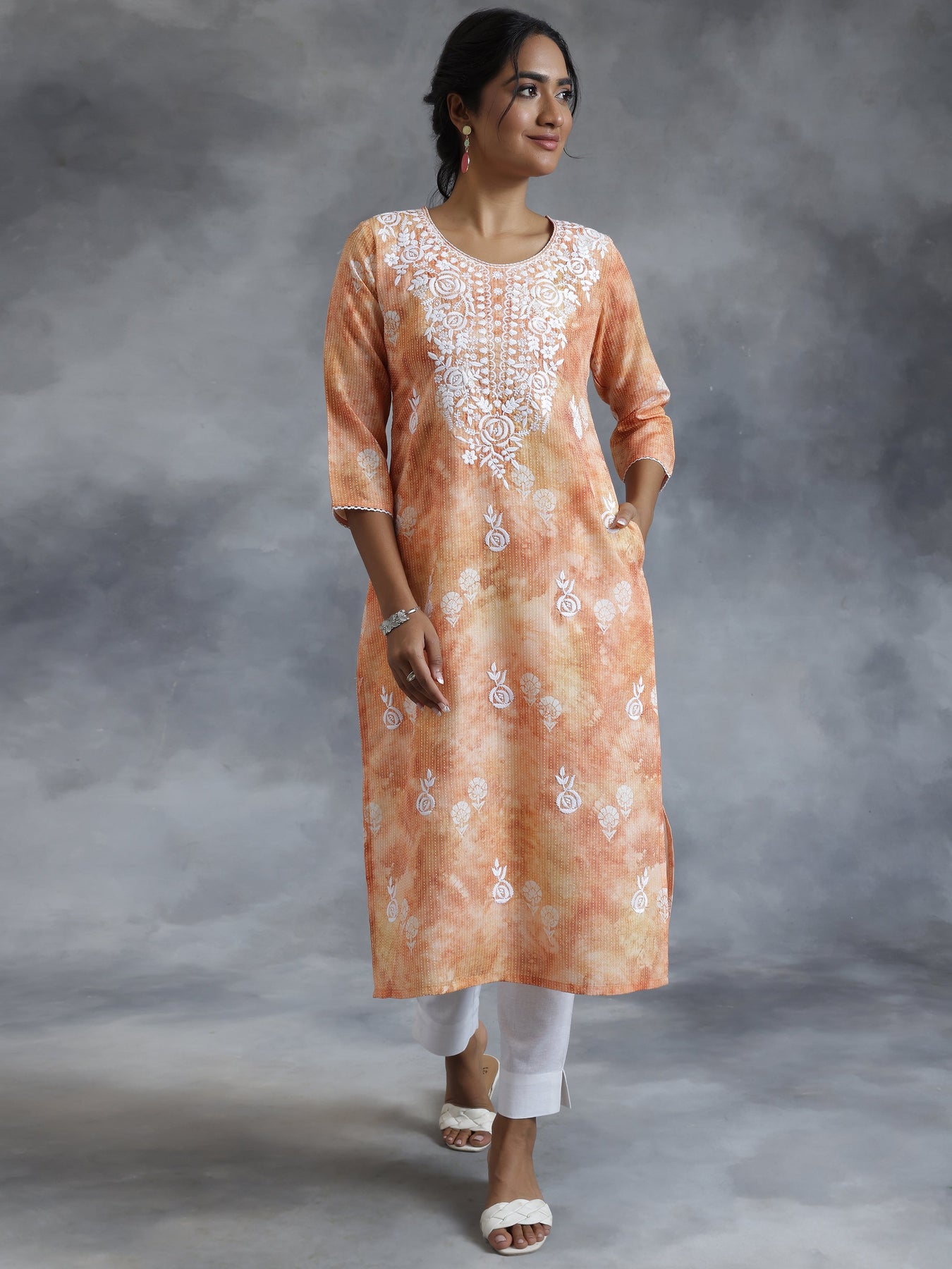 Our rust printed straight-fit kurta crafted in cotton fabric features a round neckline, three-quarter sleeves, and a statement yoke. Elevated with intricate floral embroidery, this style is perfect for casual outings.