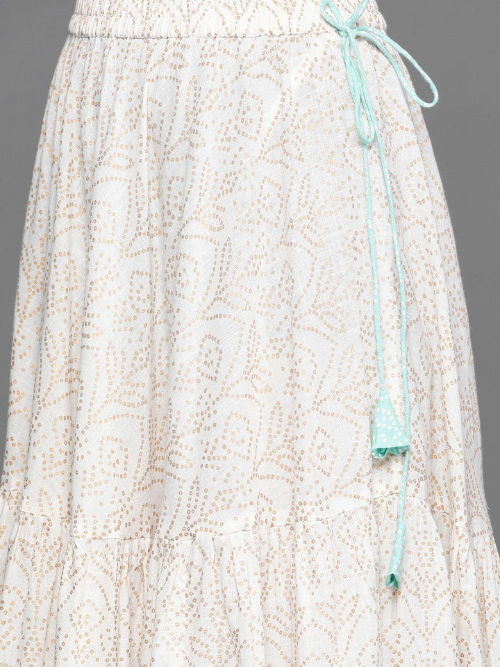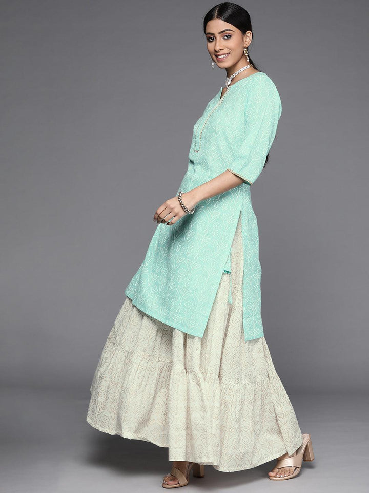 Our 3-piece sea green printed cotton suit set features a straight-fit Bandhani inspired print kurta with a notched neckline, three-quarter sleeves, a flounced skirt with a partially elasticated waistband and complementing dori-details, and a dupatta in a matching solid tone. Adorned with delicate Gota Patti accents, this refreshing style is ideal for intimate festive celebrations.