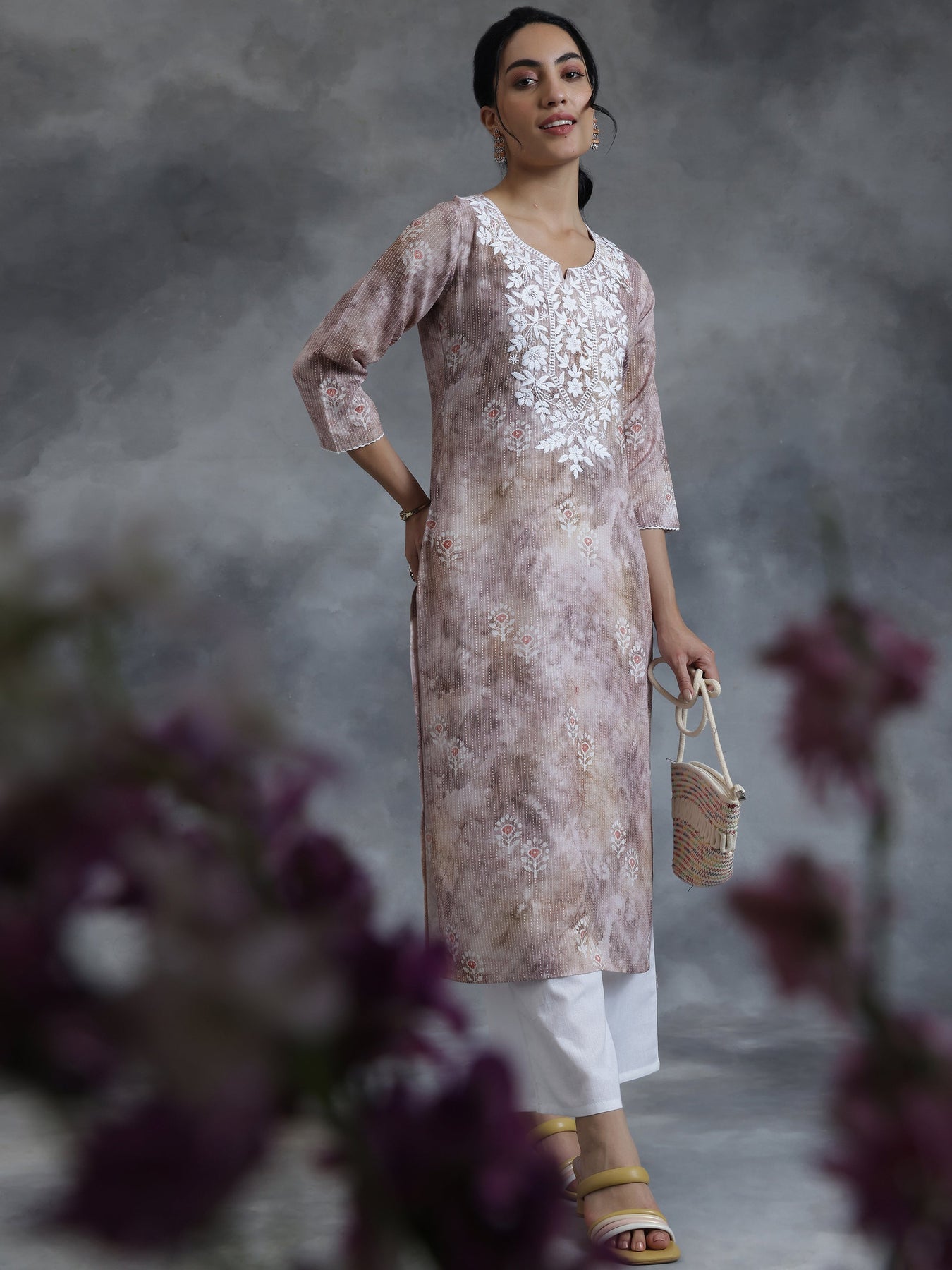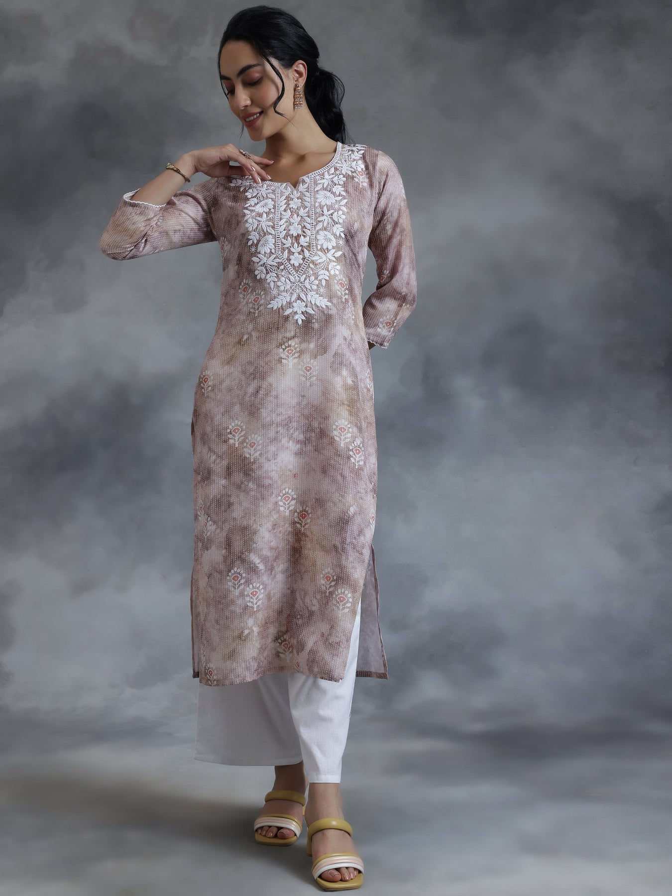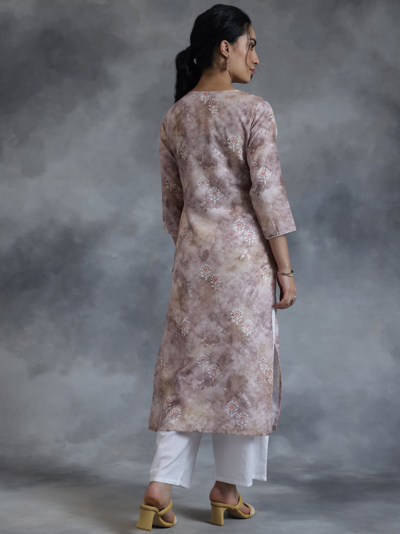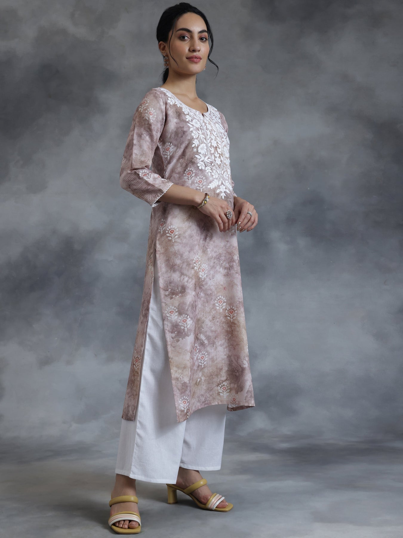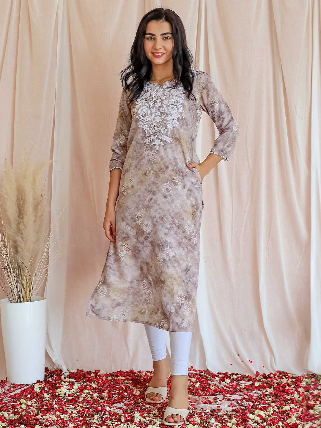Taupe Printed Cotton Straight Kurta
