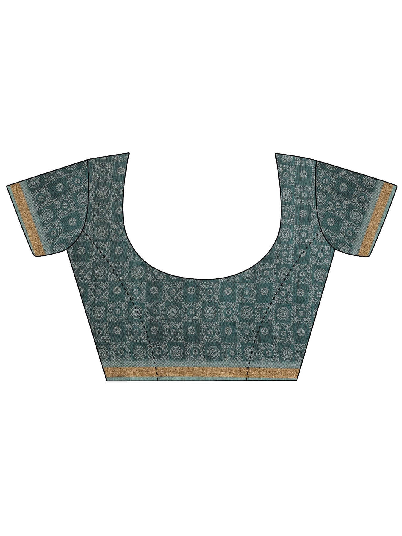 Teal Printed Silk Blend Saree With Unstitched Blouse Piece