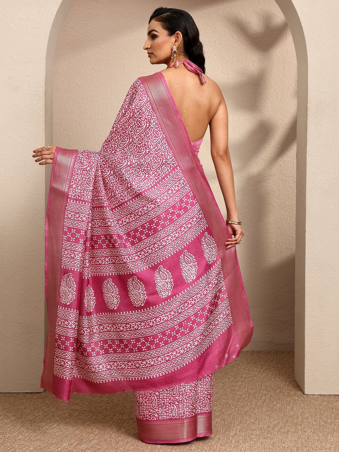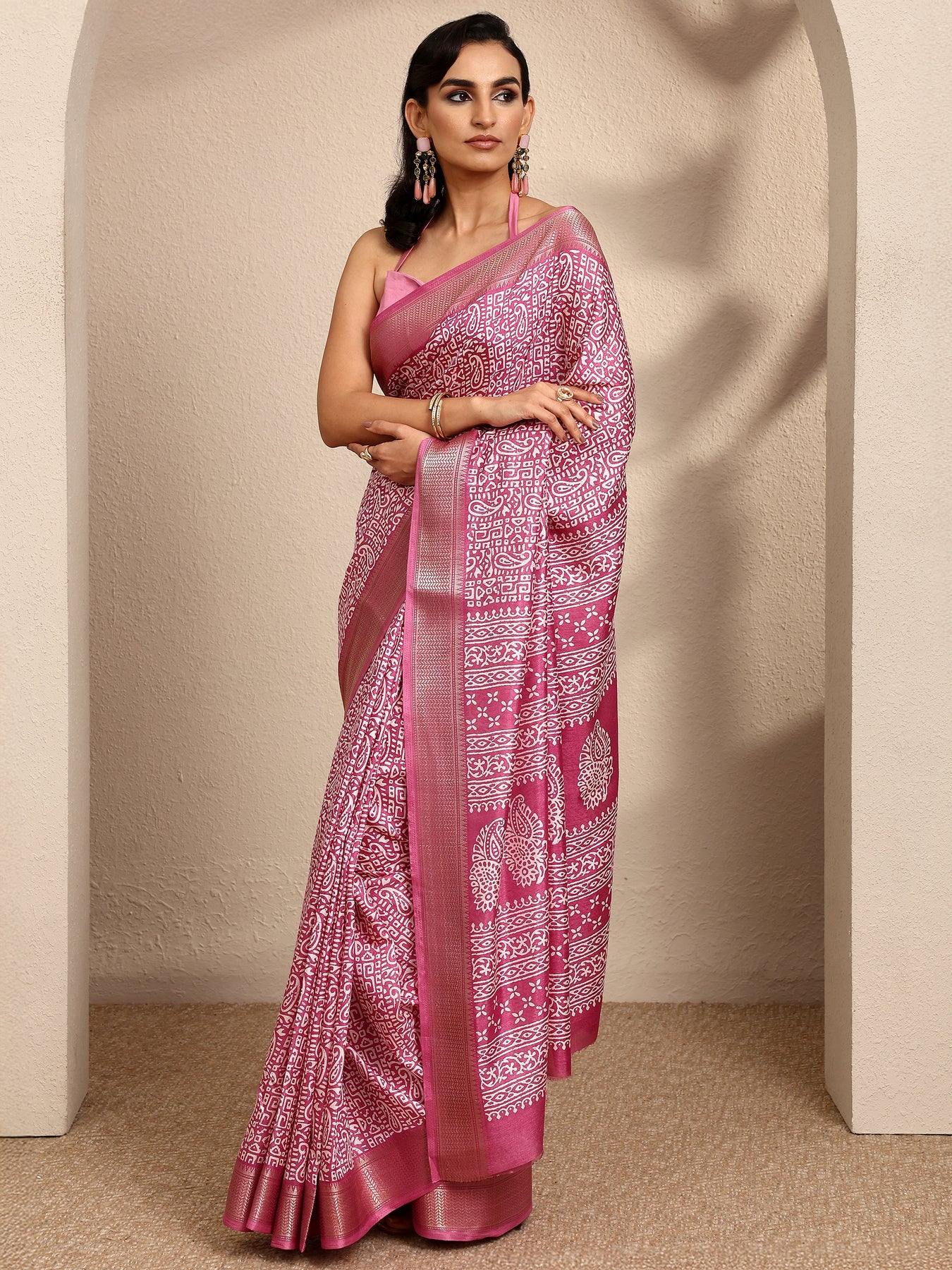 Our pink printed silk blend saree features captivating paisley print. Complemented with an unstitched blouse piece. This charming saree is perfect for festive occasions.