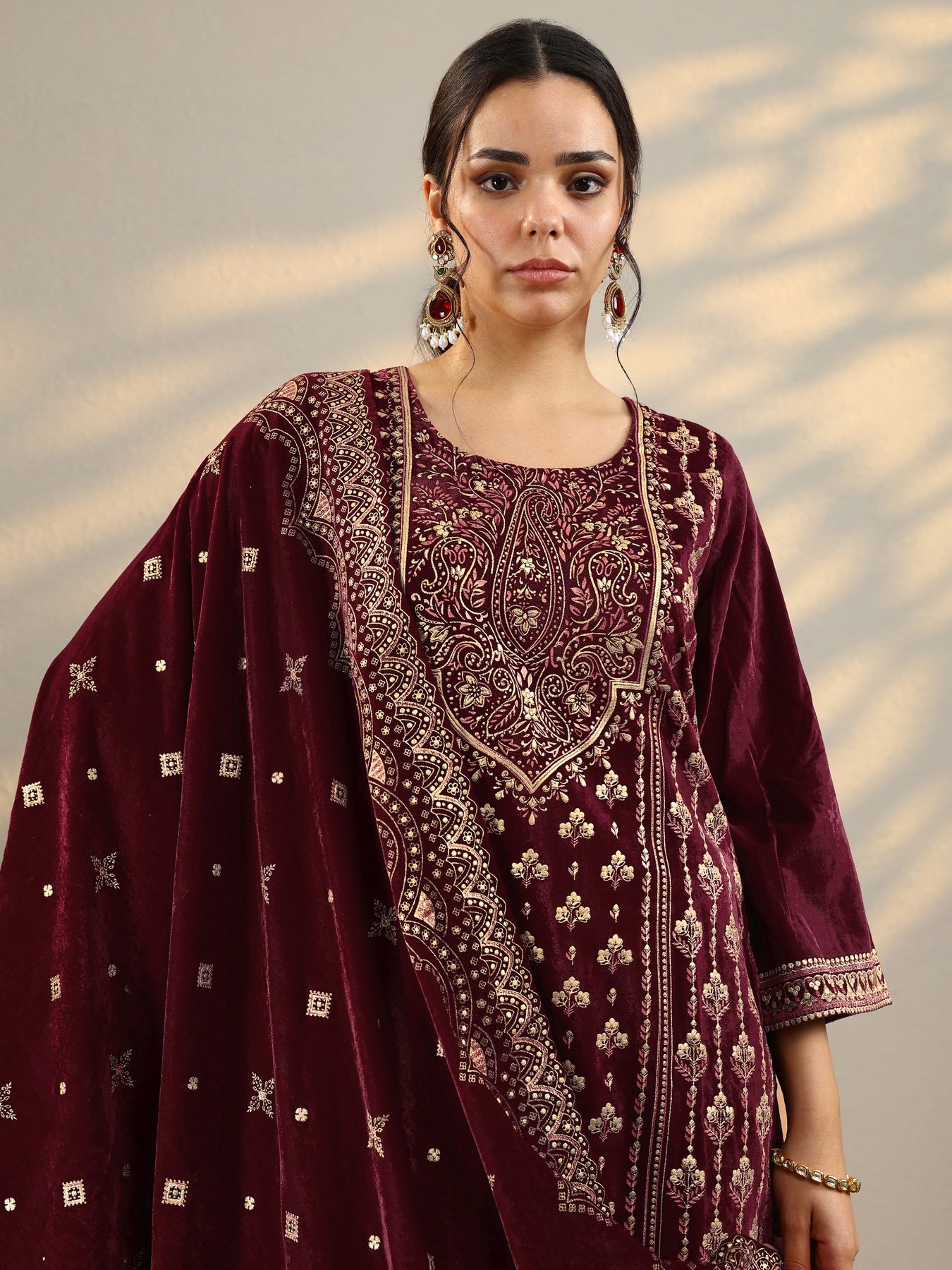 Our 3-piece maroon velvet suit set features a straight-fit kurta with a square neckline, regular sleeves, and a statement yoke. Complemented with straight pants with an elasticated waistband and an embroidered dupatta. Adorned with embroidered embellishments, this style is perfect for winters.