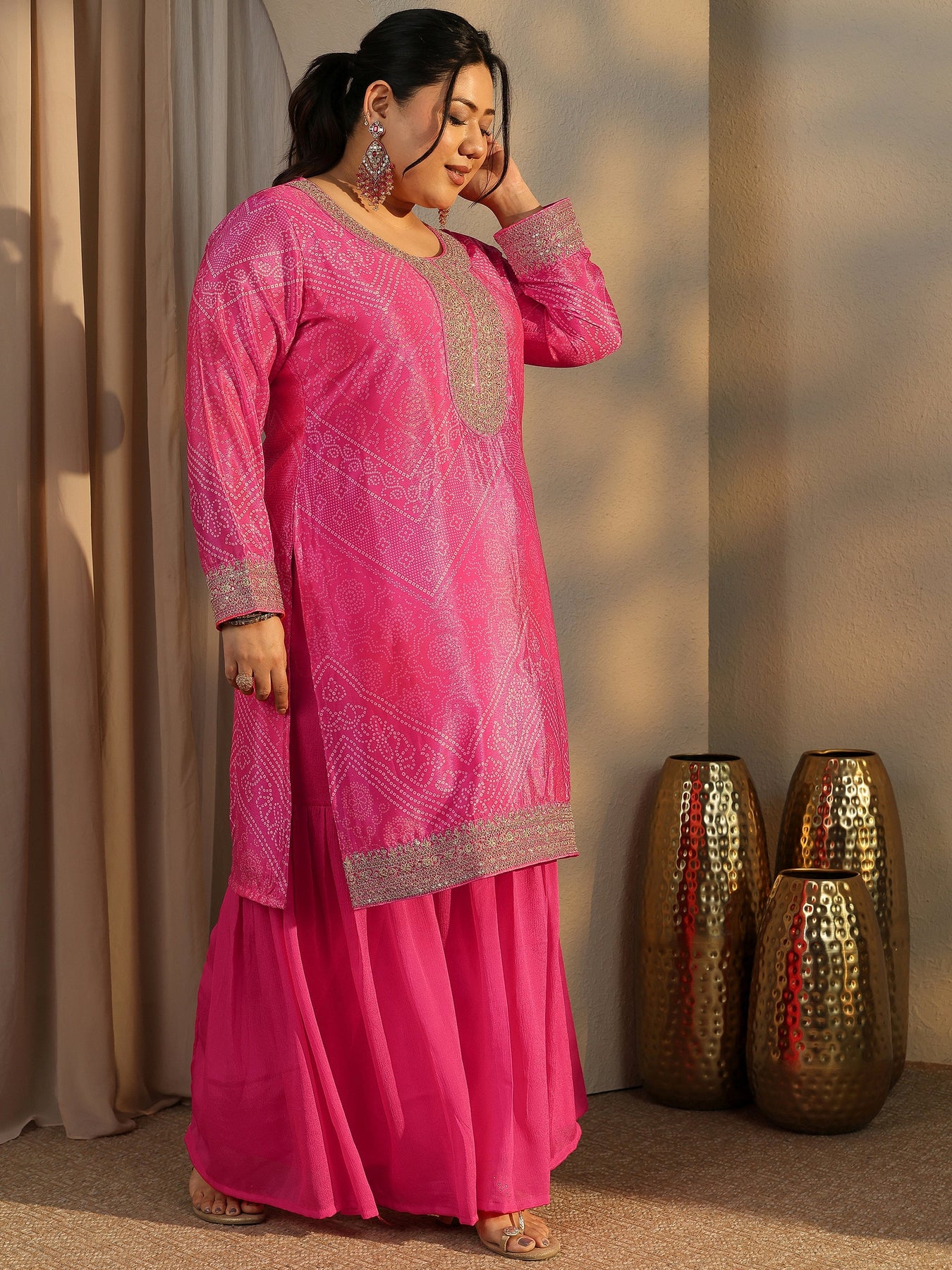 Our 3-piece Pink Chinon Straight-Fit Kurta Set features a Round Neckline, Regular Sleeves, and statement yoke. Complemented with Sharara Pants with a Partially Elasticated waistband, and an Embroidered dupatta. Adorned with bandhani printed, this style is perfect for Festive occasions.