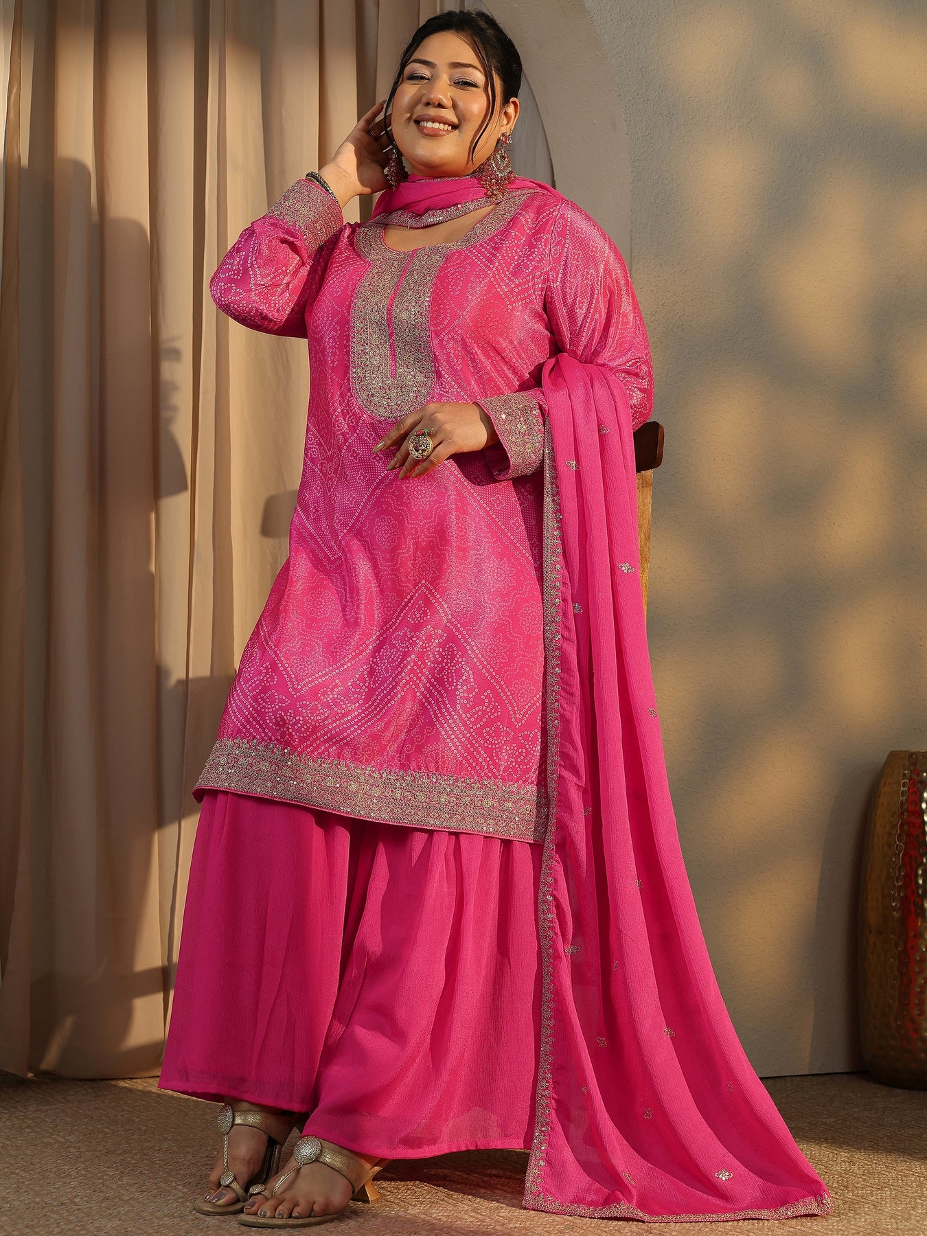 Plus Size Bandhani Embroidered Chinon Straight Suit Set With Dupatta