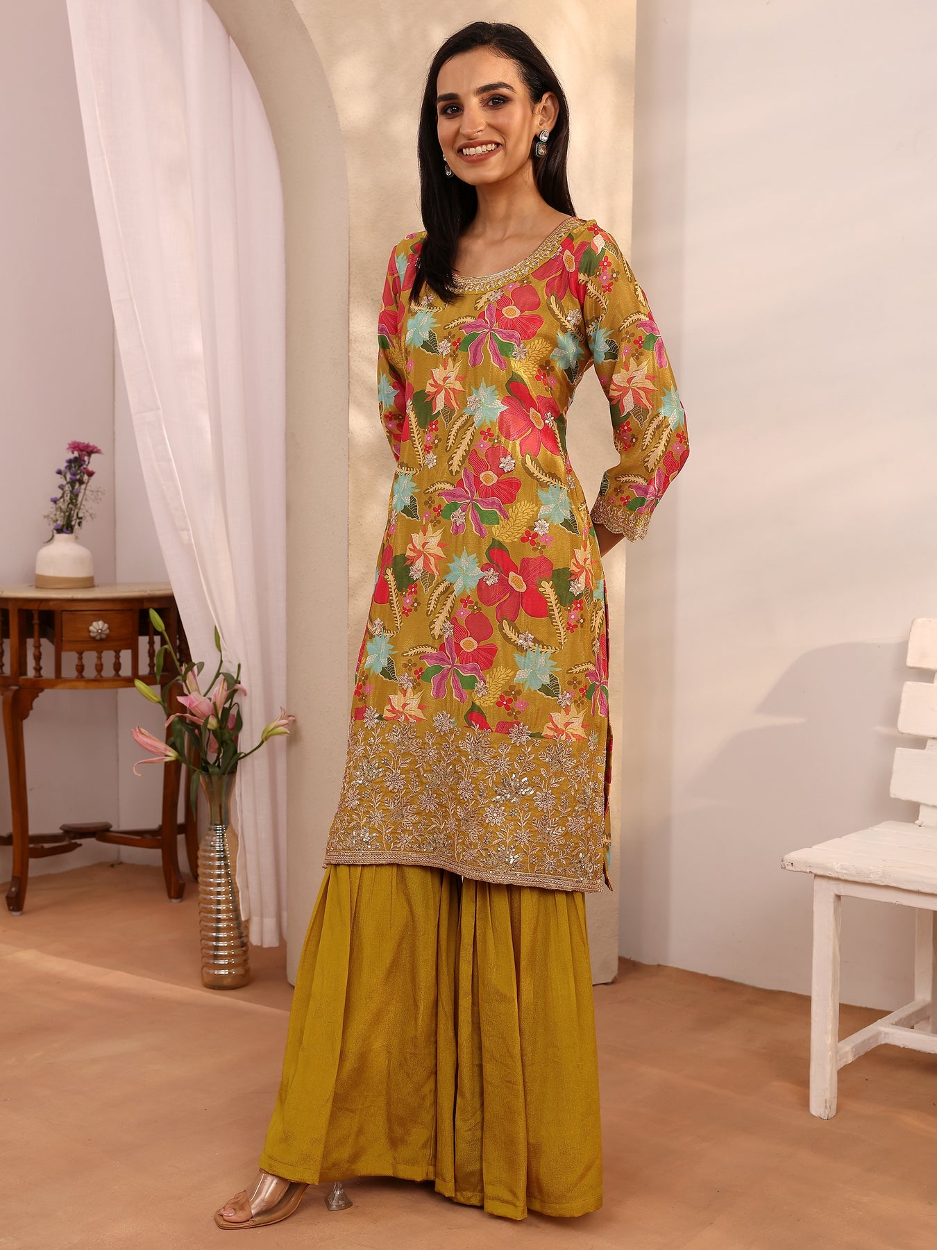 Our 3-piece multi Chinon straight-fit kurta set features a round neckline, regular sleeves, and statement yoke. Complemented with Sharara pants with a partially elasticated waistband and a solid dupatta. Adorned with floral printed, this style is perfect for festive occasions.